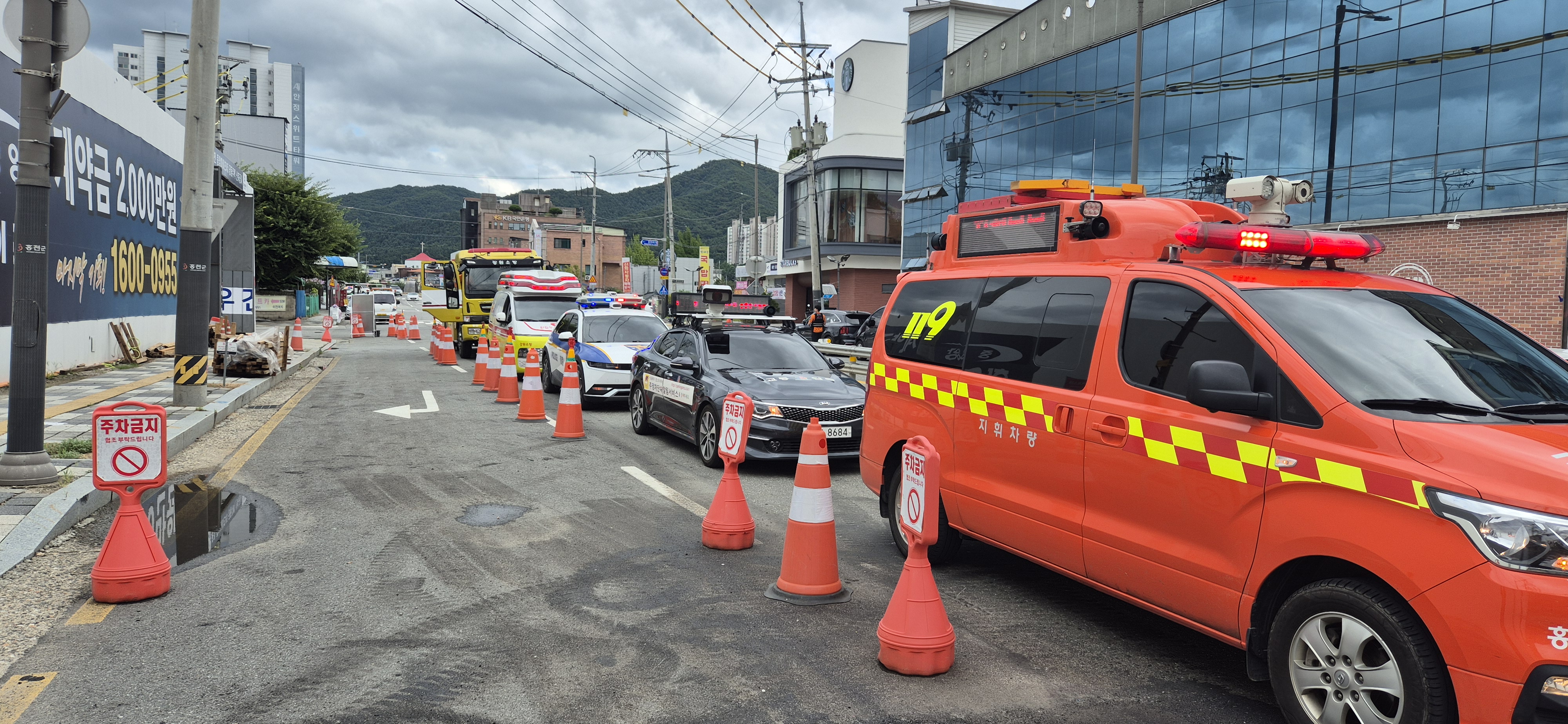 훈련은 오후 2시부터 20분간 교통량이 많은 차량 정체구간이나 소방차의 신속한 진입이 곤란한 지역 등 화양교~전통·중앙시장~터미널을 포함하여 4개 구간에서 인원 29명 / 장비 9대를 동원하여 동시 진행이 됐다.
