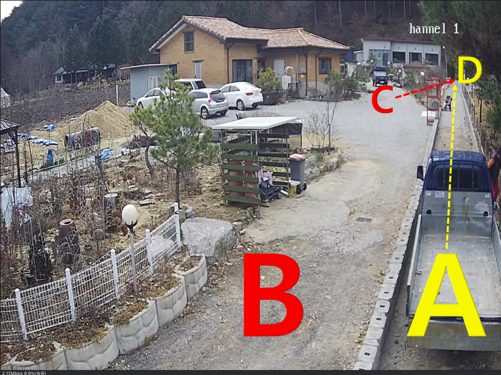 C 위치로 부터 A통로 끝 주택까지의 거리(C-D)는 약 20m 입니다. (적색 점선)