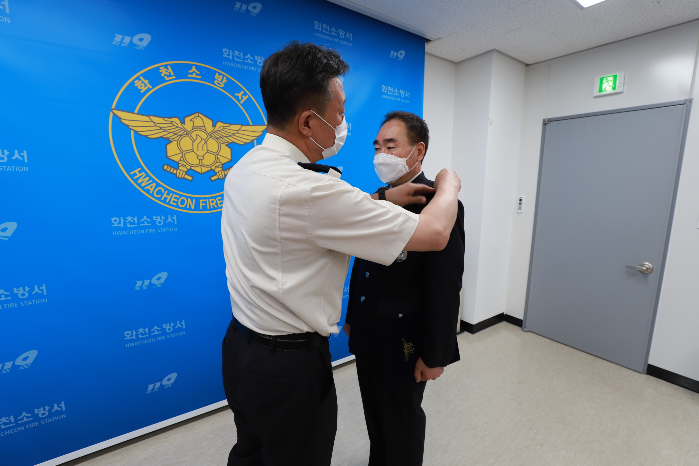 화천소방서는 김영신 소방위(소방경 근속승진)에 대한 승진 임용 신고식을 진행하였습니다.