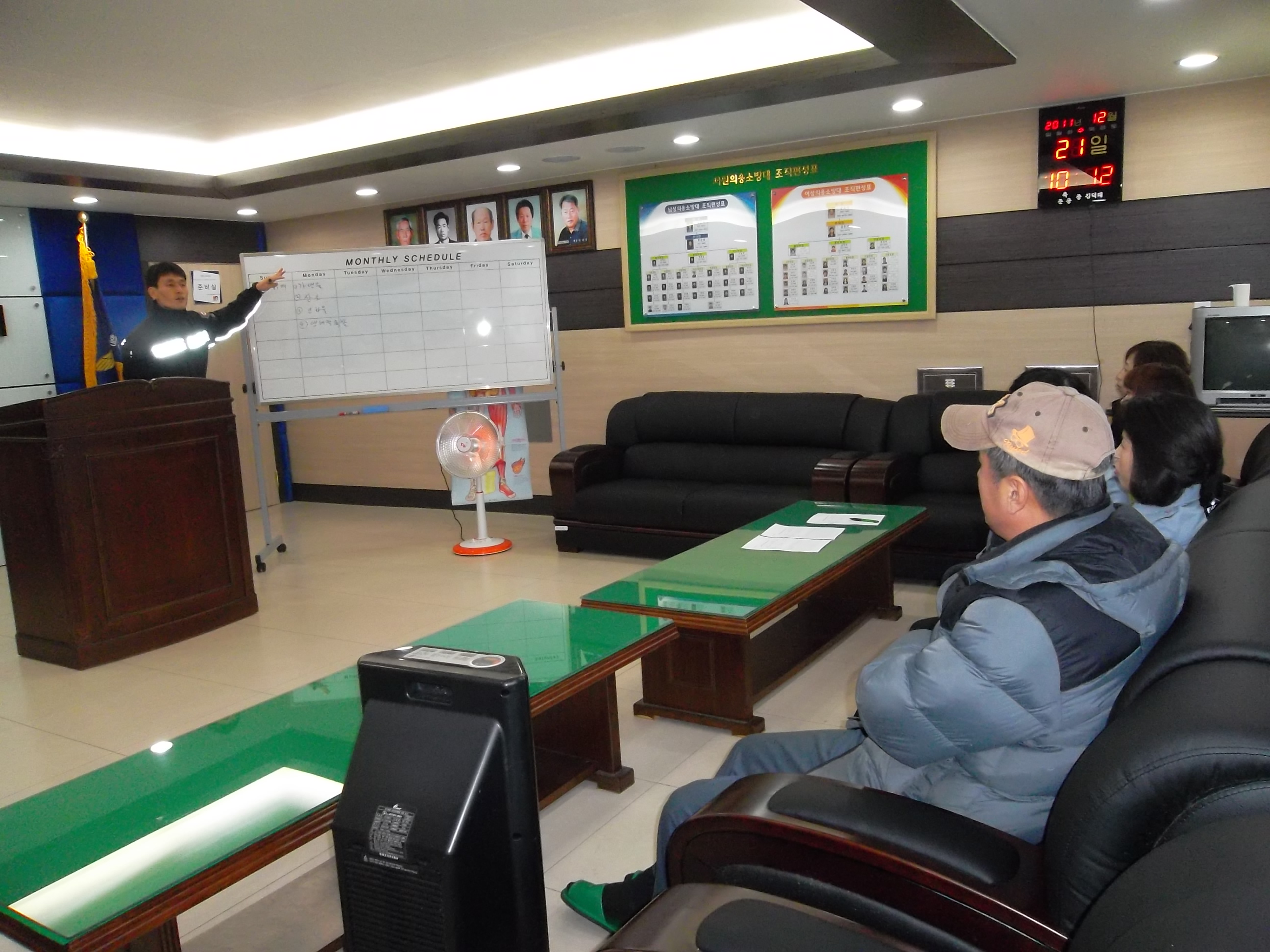 횡성소방서(서장 조근희) 서원지역대에서는 11.12.21(수) 각 남녀 대장님이 참석한 가운데 보충 보수교육을 실시하였습니다. 눈오는 날씨에도 많은 대원들이 참석했고, 횡성센터장님의 특별 교육과 펌프차 및 현장에서의 안전사고 교육을 하였습니다.