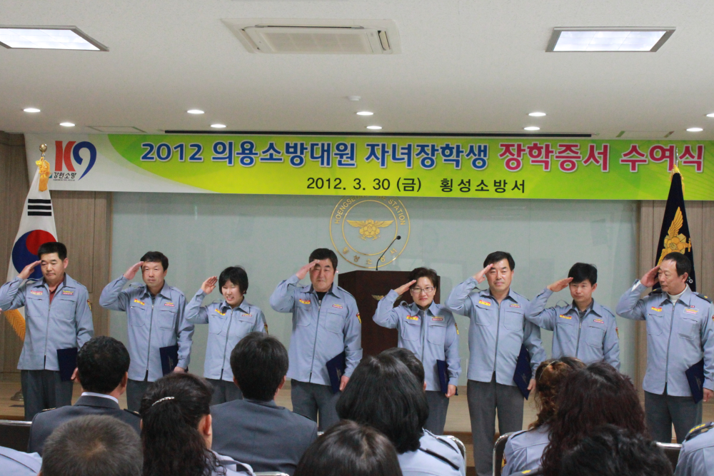 횡성소방서(서장 조근희)는 30일(금) 오후 3시 소방서 대회의실에서 의용소방대원 및 소방공무원 등 50여명이 참석한 가운데 2012년도 상반기 의용소방대자녀 장학생 장학증서 수여식을 가졌다.