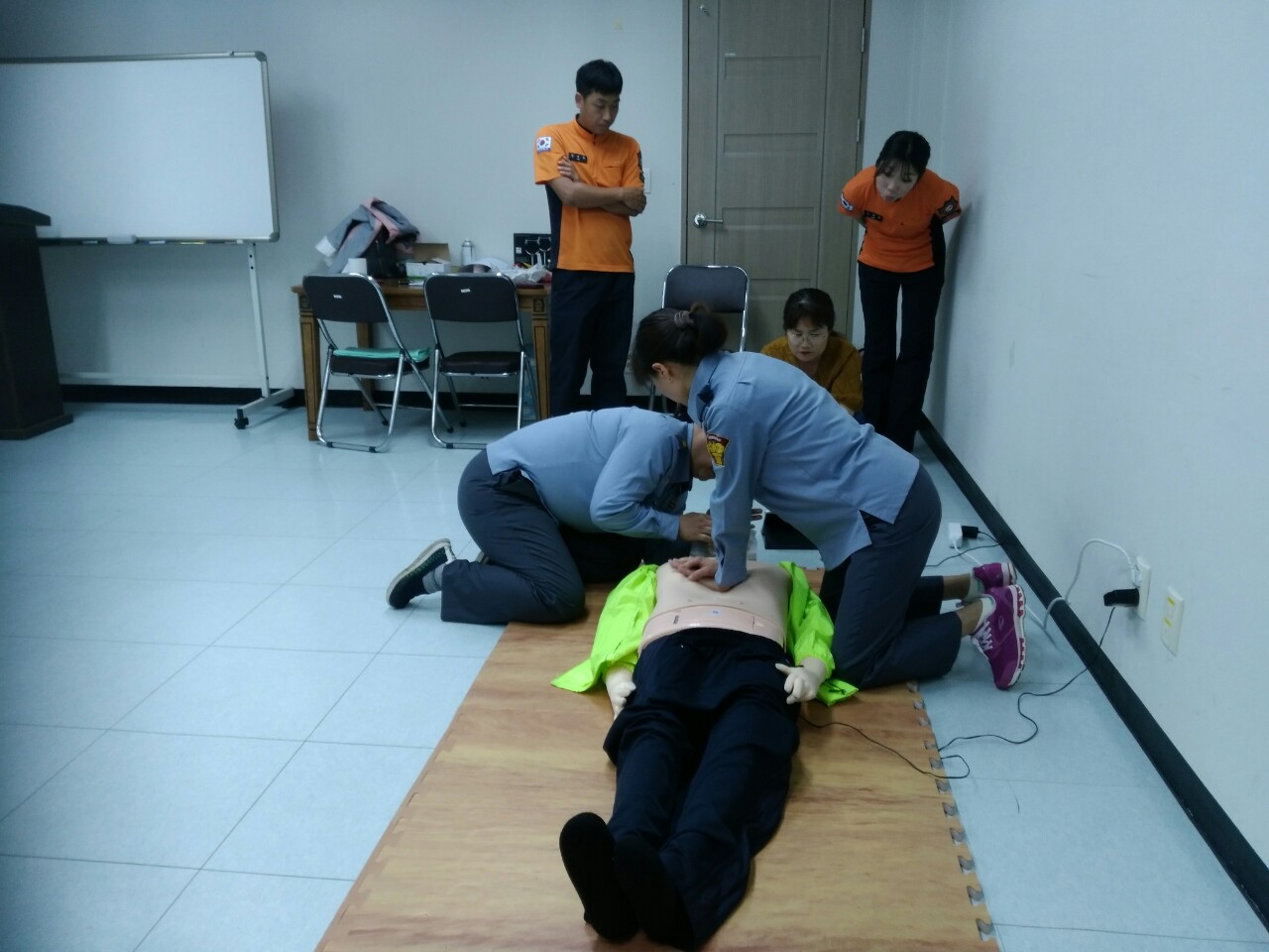 우천여성대 대정 홍정숙,부대장 김영숙,대응반장 백금녀 대원은 연일 저녁에 우천센터에서 심폐소생술 연습에 여념이 없습니다. 선수단에 많은 격려 부탁합니다. 최선을 다해 준비하겠습니다.