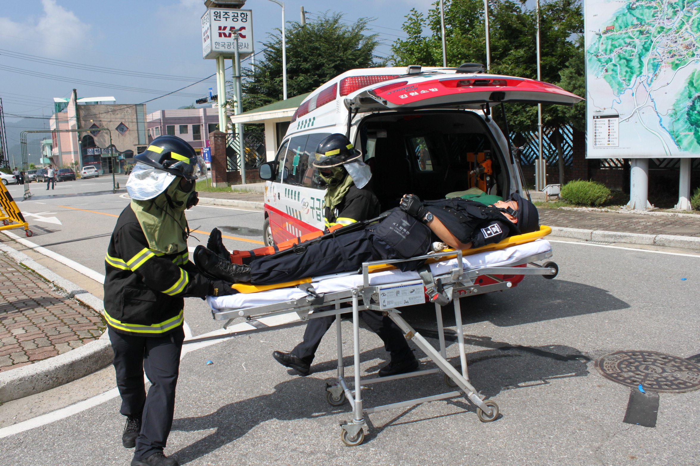 횡성소방서(서장 조근희)는 2010을지훈련 연습 기간중 강원도 시범 실제훈련인 2010원주공항 횡성터미널 테러대비훈련을 실시하였습니다. 신원미상의 테러범이 공항내 승객들을 인질로 위협하면서 발생한 이번훈련에서 테러범 공격에 의한 사상자 호송, 폭발물 및 화학탄 공격에의한 제독 및 화재진압훈련을 중점적으로 실시하였으며 앞으로 유관기관과의 상호협력을 굳건이하여 안전한 횡성 만들기에 최선을 다하겠습니다.