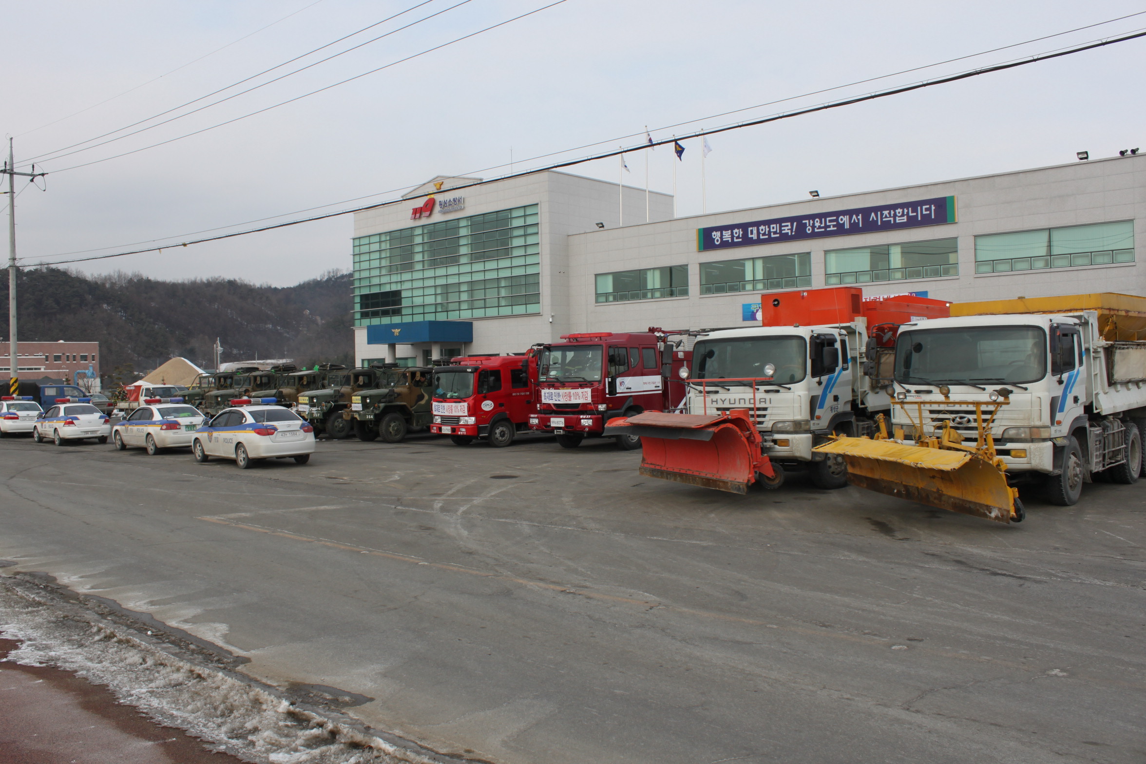횡성소방서는 구제역 발생 이후 각급 유관 기관.단체의 방역 전초기지가 되어 방역초소 급수지원 뿐만 아니니라 경찰차-제독차-펌프차-제설차가 1조가 되어 4개조로 편성된 도로방역 전담조를 운영하여 방역활동에 만전을 기하고 있다.