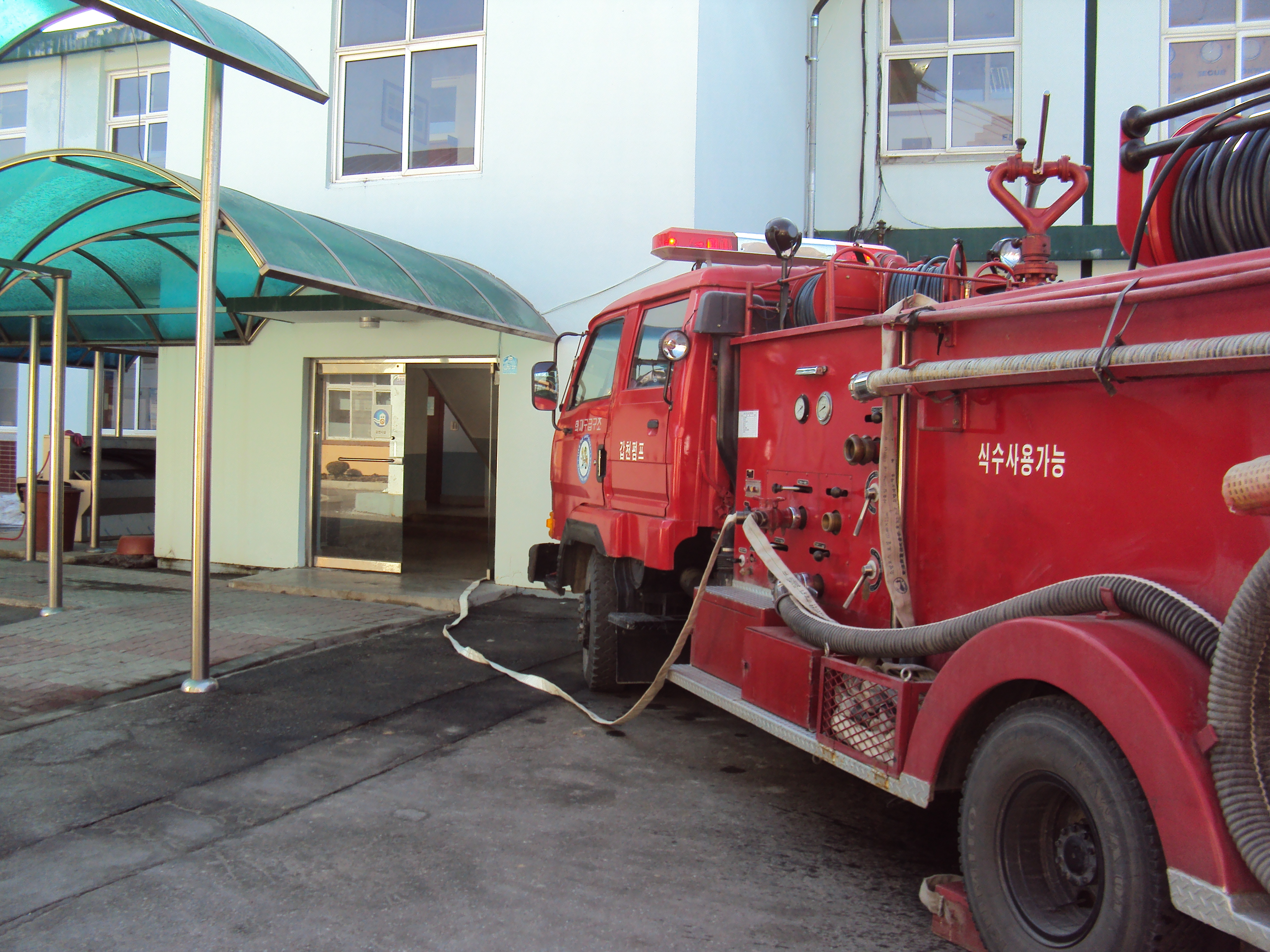 행정실을 화점으로 호수 3본을 연장하여 화재 진압 훈련을 실시하였습니다.