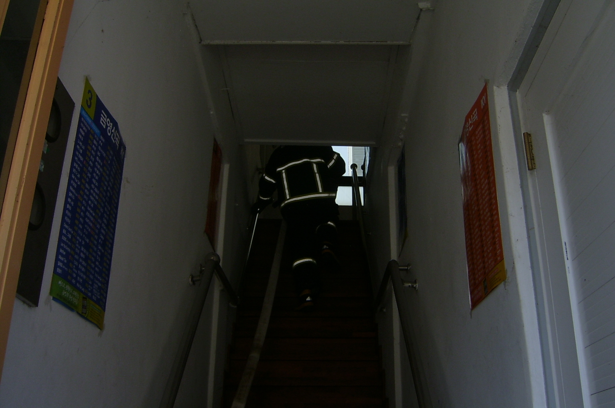 1번 룸을 화점으로 호수 2본을 연장하여 화재 진압 훈련을 실시하였습니다.