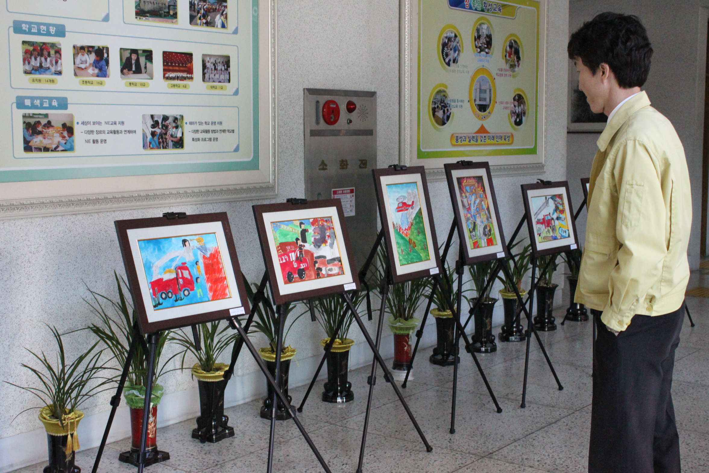 횡성소방서(서장 조근희)는 21일 오전11시 2010년,2011년 어린이 불조심 사생대회에서 입상한 우수작품 20점을 횡성교육지원청 로비에 전시하였다. 이번 전시는 21일부터 23일까지 교육지원청에 방문하는 이웃들에게 관람하게 함으로써 겨울철 화재예방과 안전의식을 고취시키는 좋은 기회가 될 것이다.