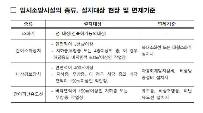 임시소방시설 종류, 설치대상 현장 및 면제기준에 대해 참고하시기 바랍니다.