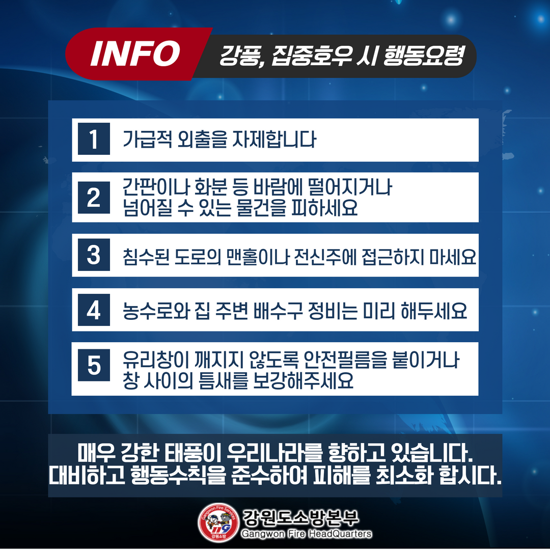 매우 강한 태풍이 우리나라를 향하고 있는 만큼 대비하고 행동수칙을 준수하여 피해를 최소화 합시다.