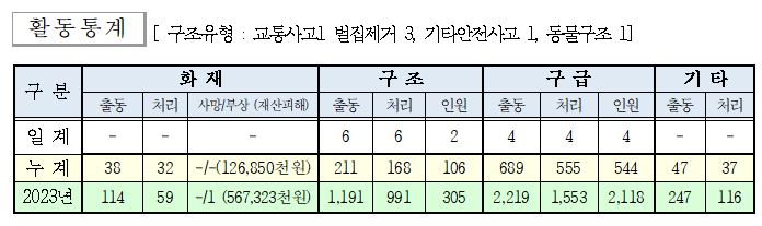 ○ 구조 6건(교통사고1, 벌집제거 3, 기타안전사고 1, 동물구조 1)
