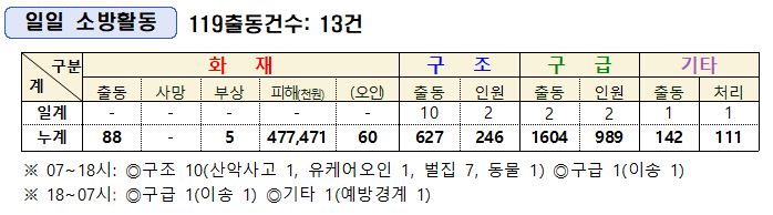 ○구조 10(산악사고 1, 유케어오인 1, 벌집 7, 동물 1)