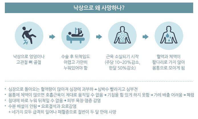 대한노인재활의학회 자료에 따르면 고관절 골절을 당한 65세 이상 노인 3명 중 1명은 1년 내에 사망했고, 80세 이상은 절반이 두 달 내 사망했습니다.