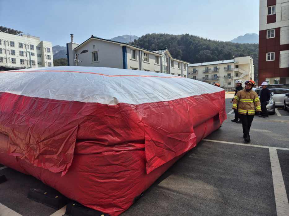 아울러 고층 화재 시 활용되는 에어매트 전개 훈련도 실시했다. 에어매트의 신속한 설치와 안전한 운영 여부를 점검하며, 실제 긴급 상황에서의 대응 능력을 강화했다.