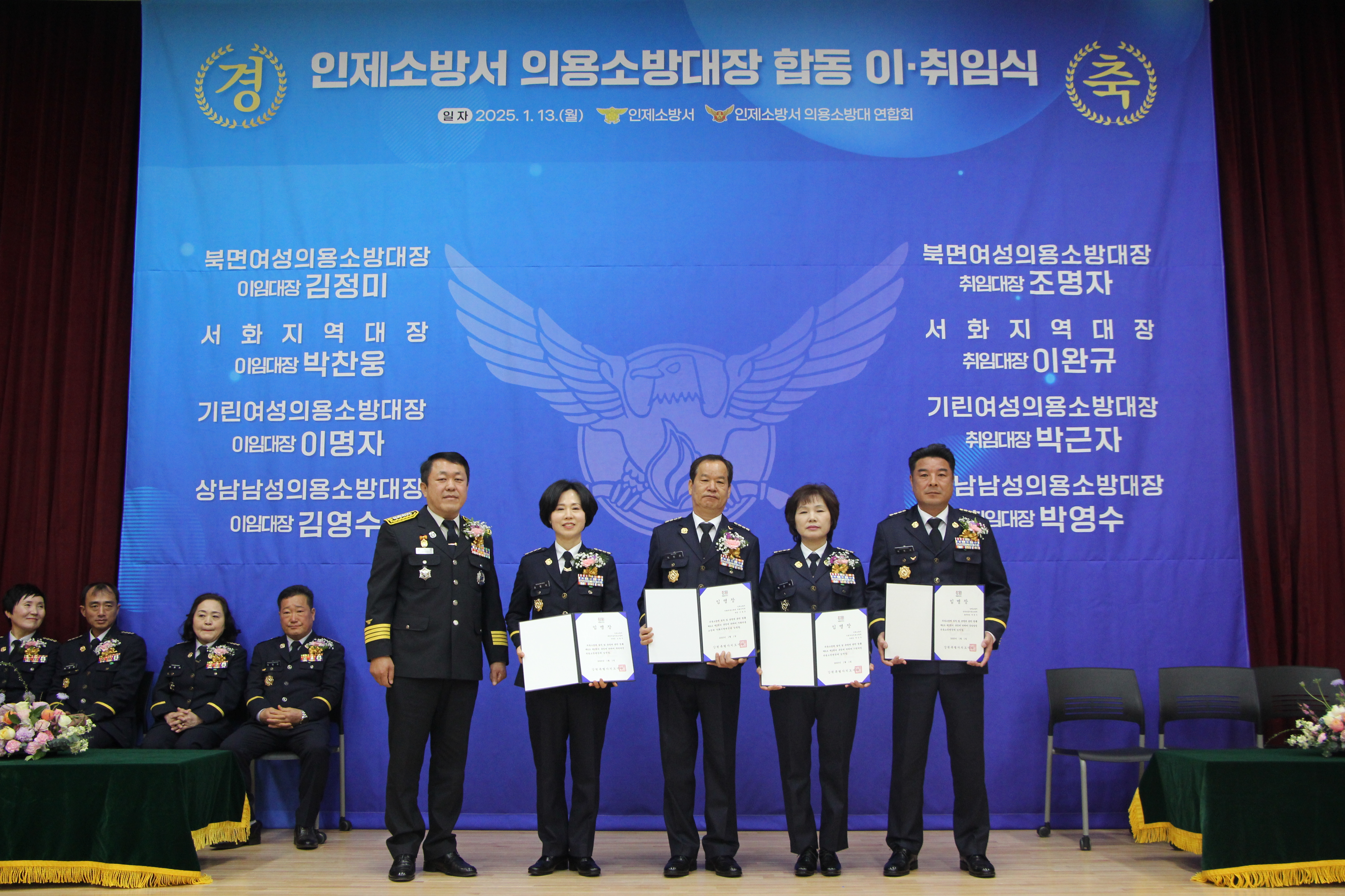 행사에서는 최상기 인제군수와 군의장, 도의원, 군의원, 소방공무원, 의용소방대원 등 약 120명이 참석한 가운데 북면 여성의용소방대, 기린 여성의용소방대, 상남 남성의용소방대, 서화 의용소방대 서화 지역대 총 4개 대 의용소방대장들의 이ㆍ취임이 진행됐다.