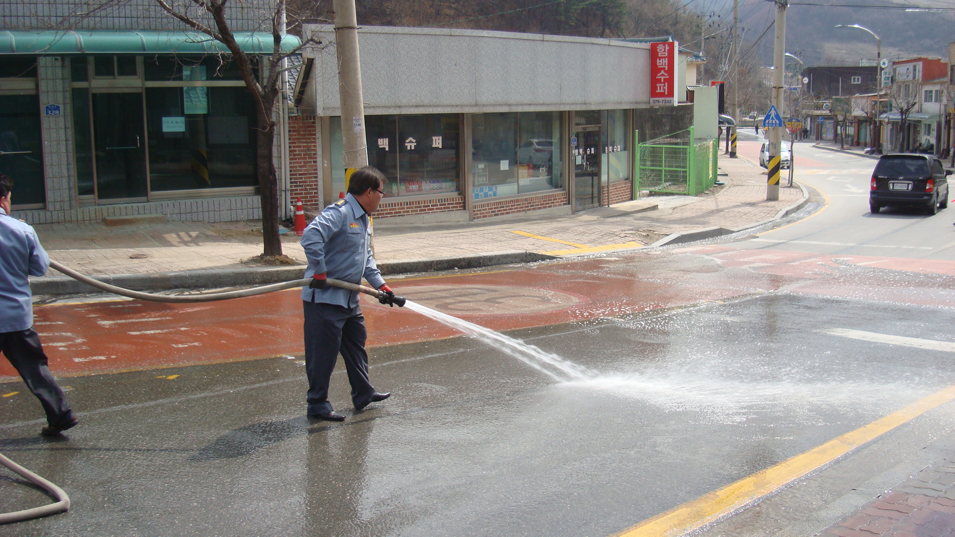 지저분한 거리를 물로 깨끗히 청소하는 함백의소대~~
