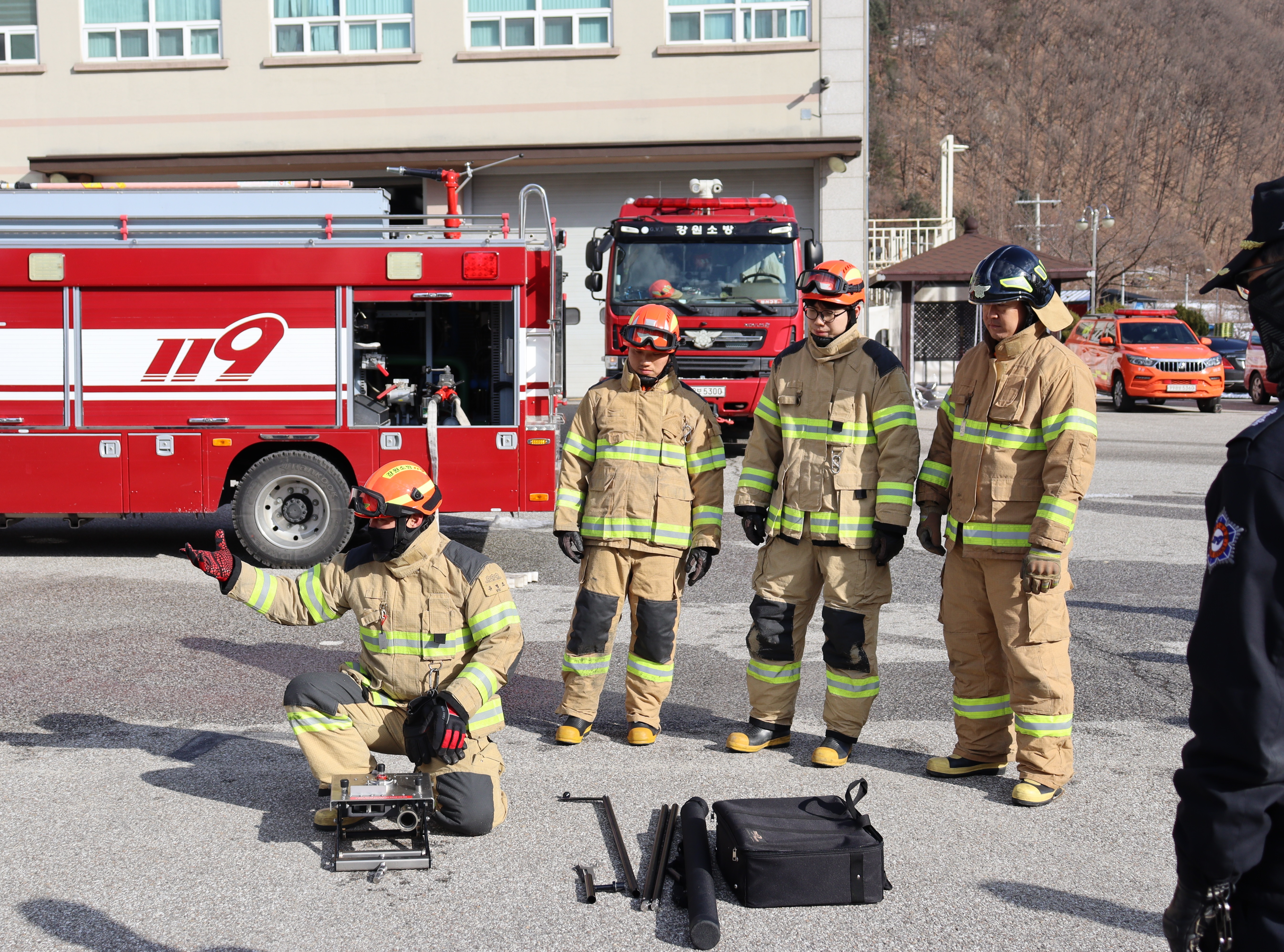 ➤ 훈련을 진행하면서 정선소방서 조양센터대원들과 119구조대원들은 EV-드릴랜스를 활용해 전기차 배터리에 직접 소화수를 주입하는 기술을 반복 숙달했다.