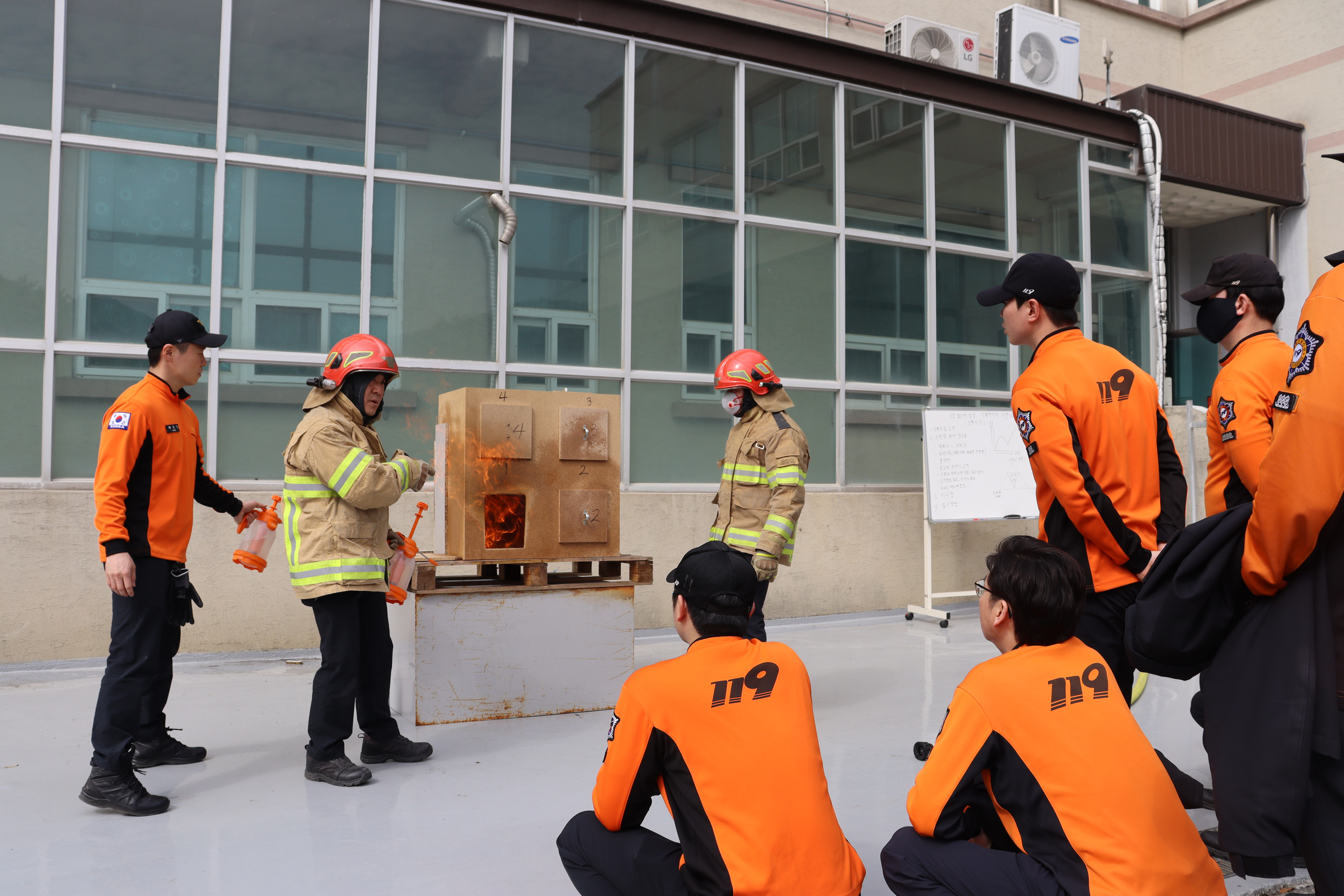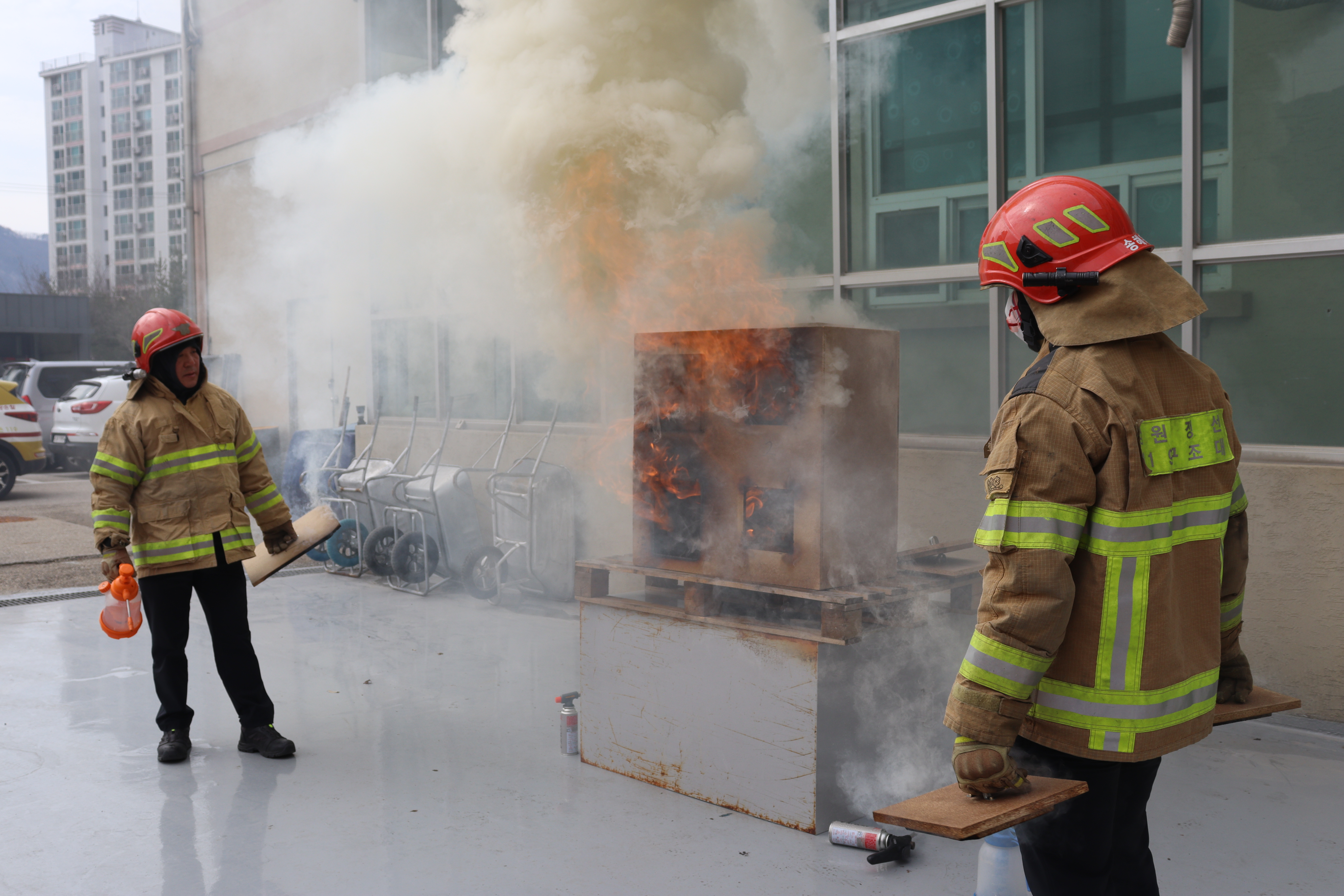 ➤ 이번 훈련은 정선소방서 119구조대원들이 자체 제작한 모형으로 직원들을 대상으로 훈련을 실시하였다. 훈련을 통해 ▲ 백드레프트 ▲ FGI(화재가스발화) ▲ 플래시오버 등 화재 성상 확인을 통한 기획실 화재의 화재대응능력 향상을 높이고자 진행되었다.
