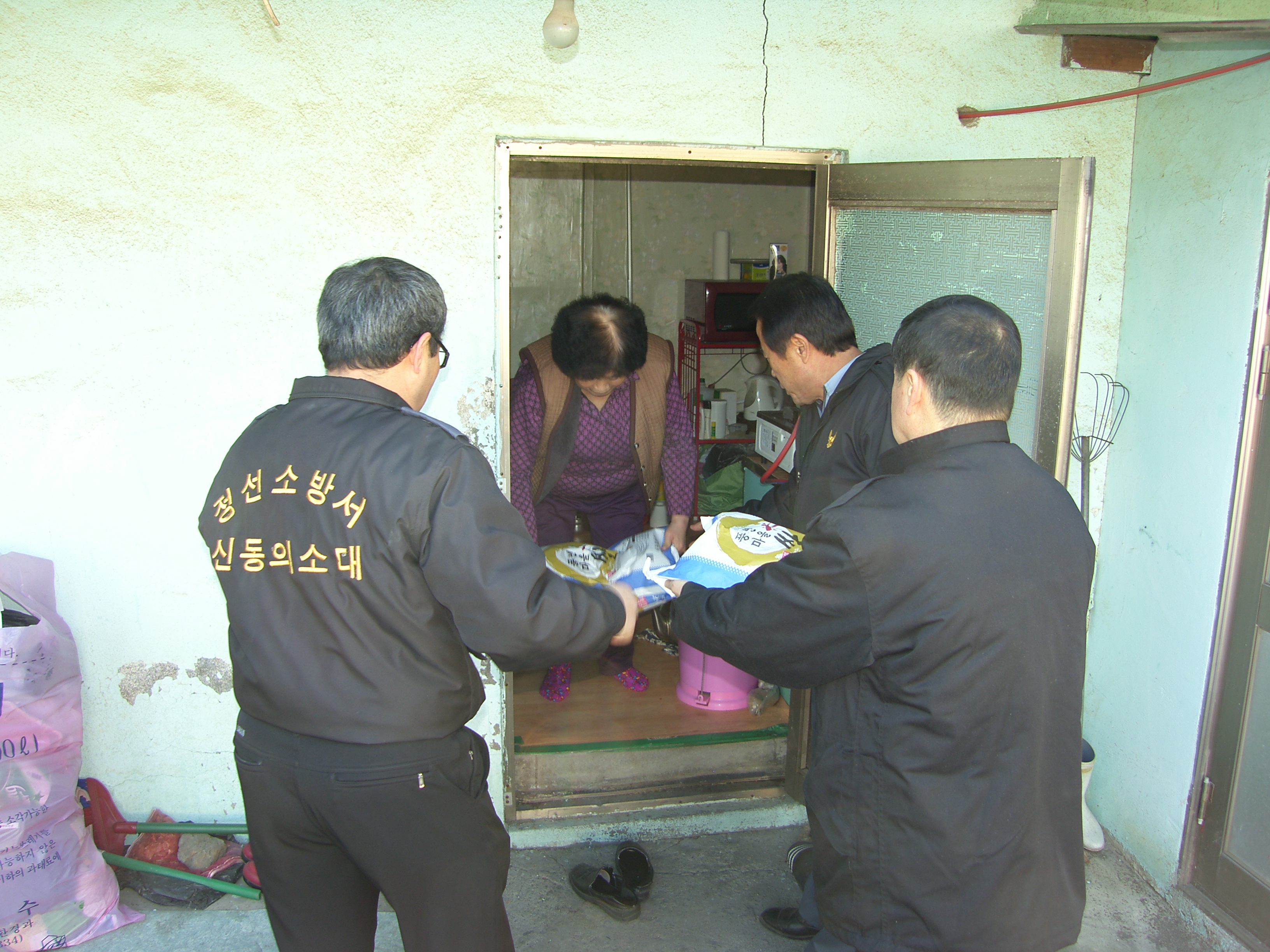 정선소방서(서장 박창진) 신동119안전센터관할 신동의용소방대(대장 김원재외 24명)에서는 연말연시를 맞이하여 불우이웃 5가구를 선정 지역주민과 함께하고자 온정의 정성을 모아 쌀20Kg 각 3포씩 전달하였습니다.