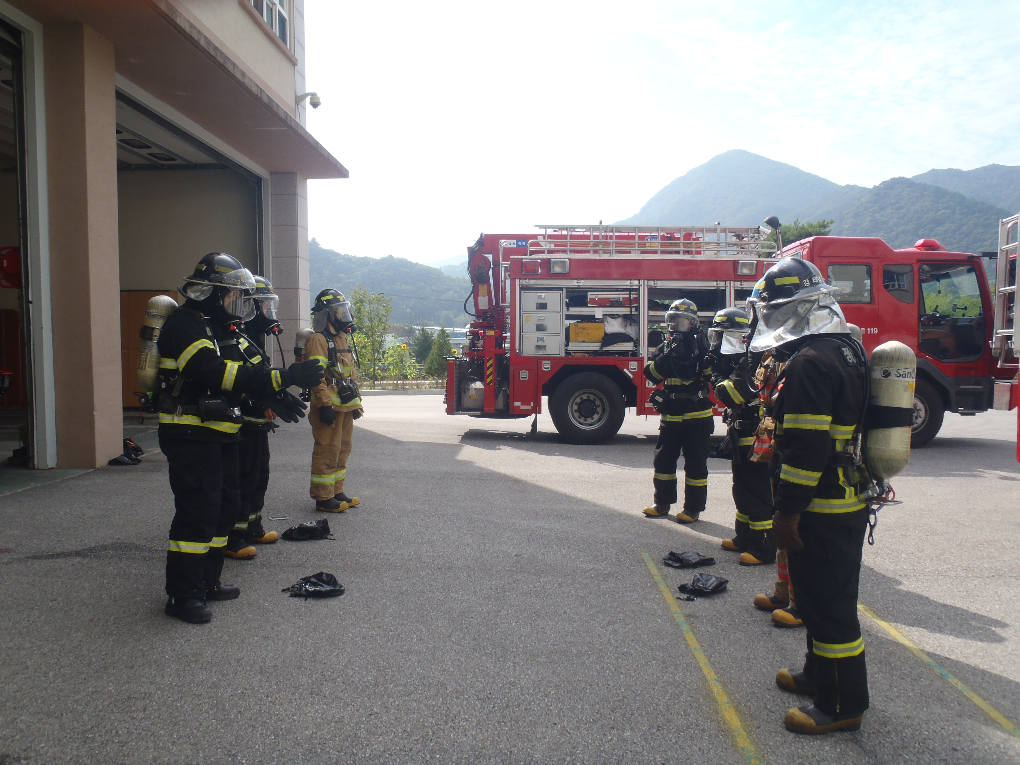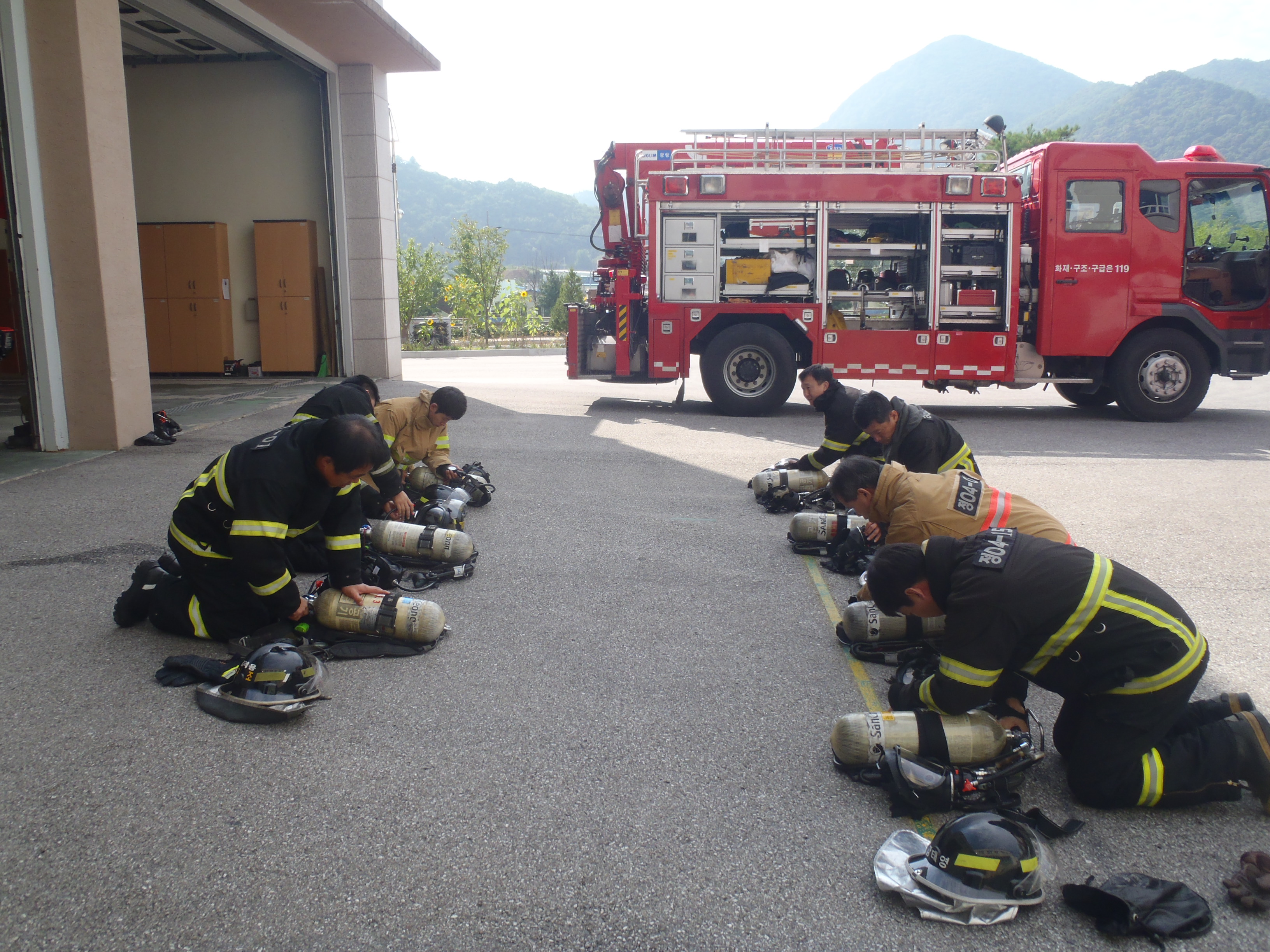 정선소방서(서장 이병광) 방호구조과 구조진압대는 2012년 9월26일 10시부터 청사 후정에서 공기호흡기 장착 및 탈착 훈련 실시하였습니다