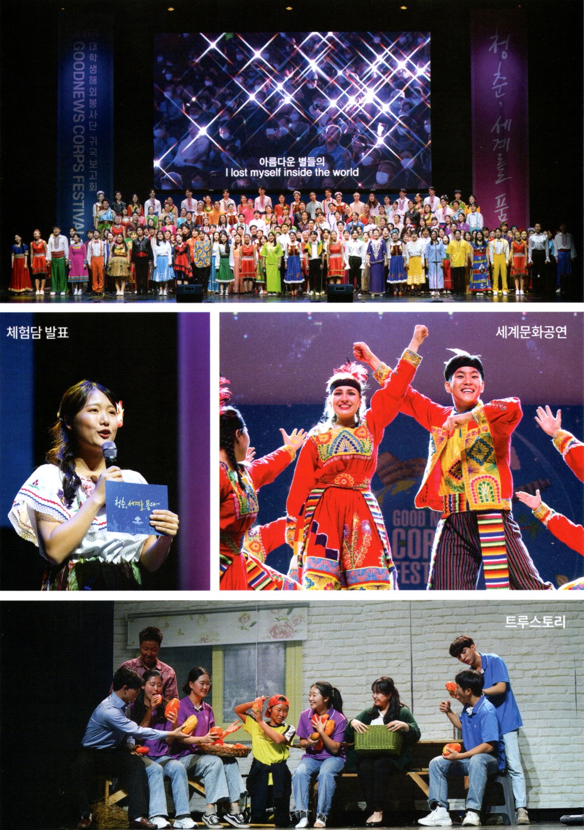 ‘청춘, 세계를 품다’라는 슬로건 아래 지구촌 곳곳에서 경험한 색다른 문화와 솔직하고 젊음이 빛나는 자신들의 이야기로 굿뉴스밴드&라이쳐스, 세계 각국 문화댄스, 리얼스토리, 체험담 등 여러 공연으로 풀어내는 문화 대축제입니다.