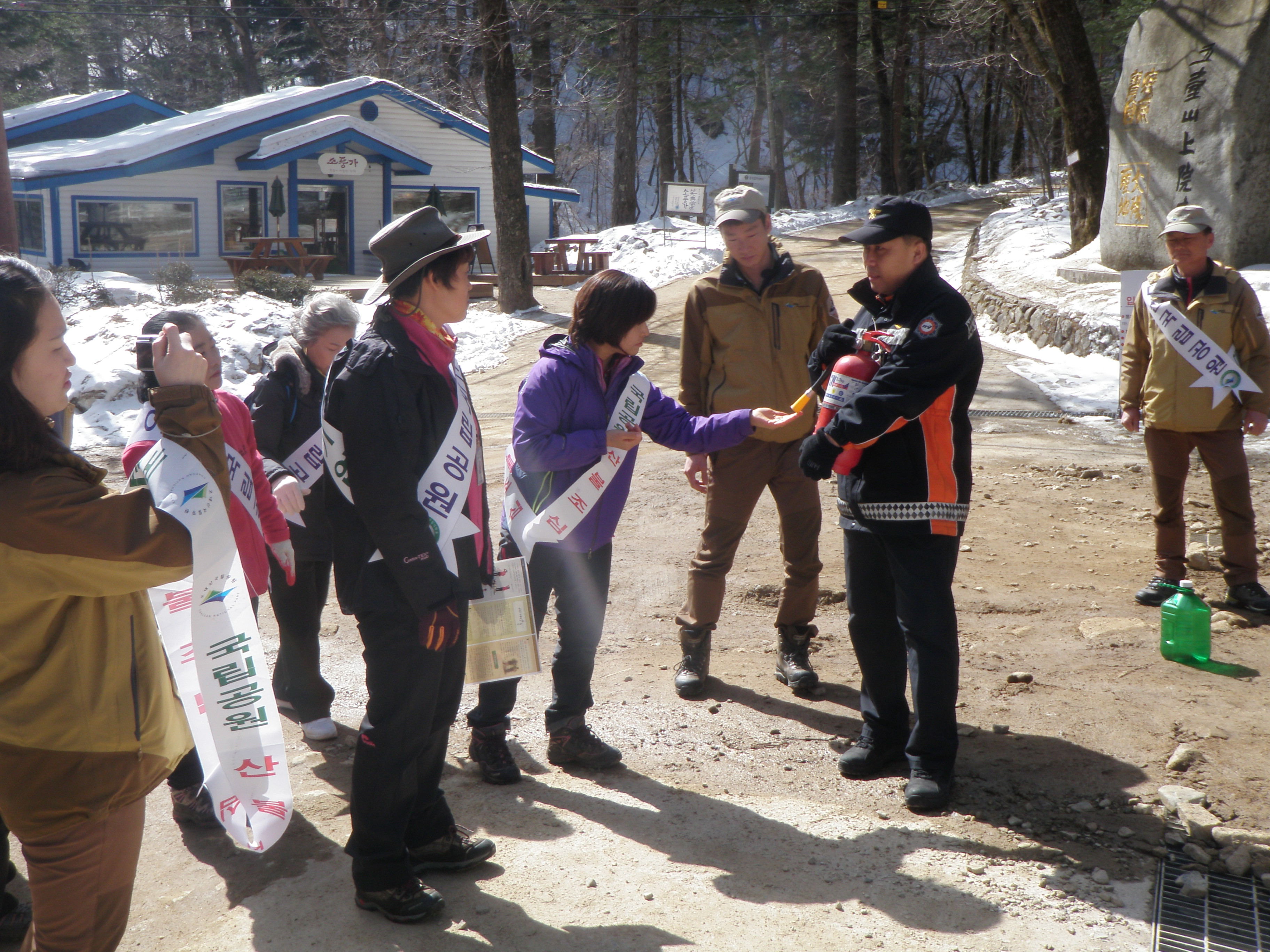 상원사 입구에서 국립공원관리공단 직원 및 등산객들과 함께