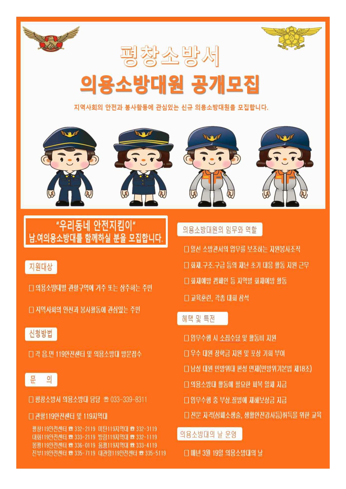 평창군민을 대상으로 신체건강하고 역량 있는 평창소방서 의용소방대원모집 공고를 '붙임'과 같이 알려드리니, 지역 사회 발전과 봉사활동에 관심있으신 지역 주민분은 많은 지원을 바랍니다.