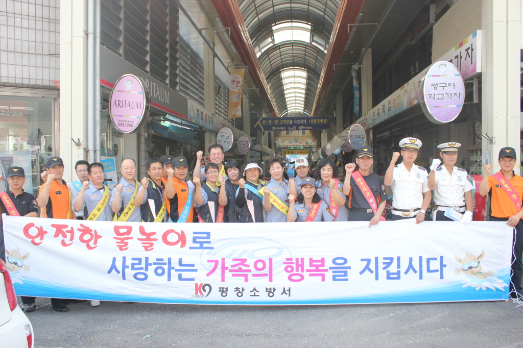 평창소방서(서장:김남숙)는 25일 14시부터 경찰 및 의용소방대와 합동으로 평창시장 및 유동둔치, 바위공원등 에서 2013 물놀이 안전사고 예방 캠페인 실시함.