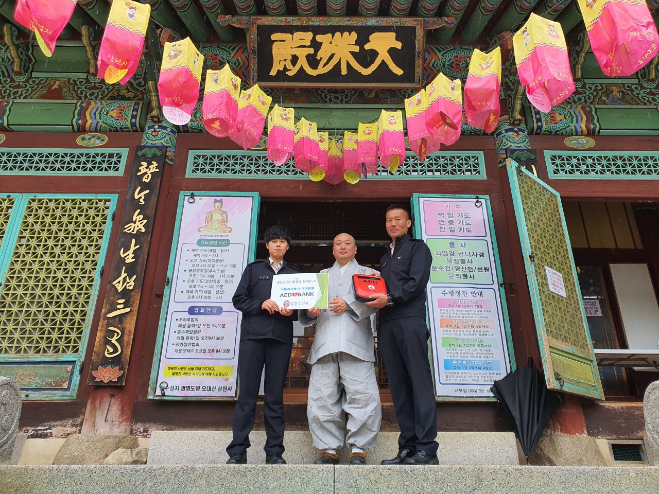 평창소방서는 19일부터 6개월간 진부면 상원사에 자동제세동기(AED) 대여은행을 활용하여 AED의 장기 대여를 추진한다고 밝혔다.