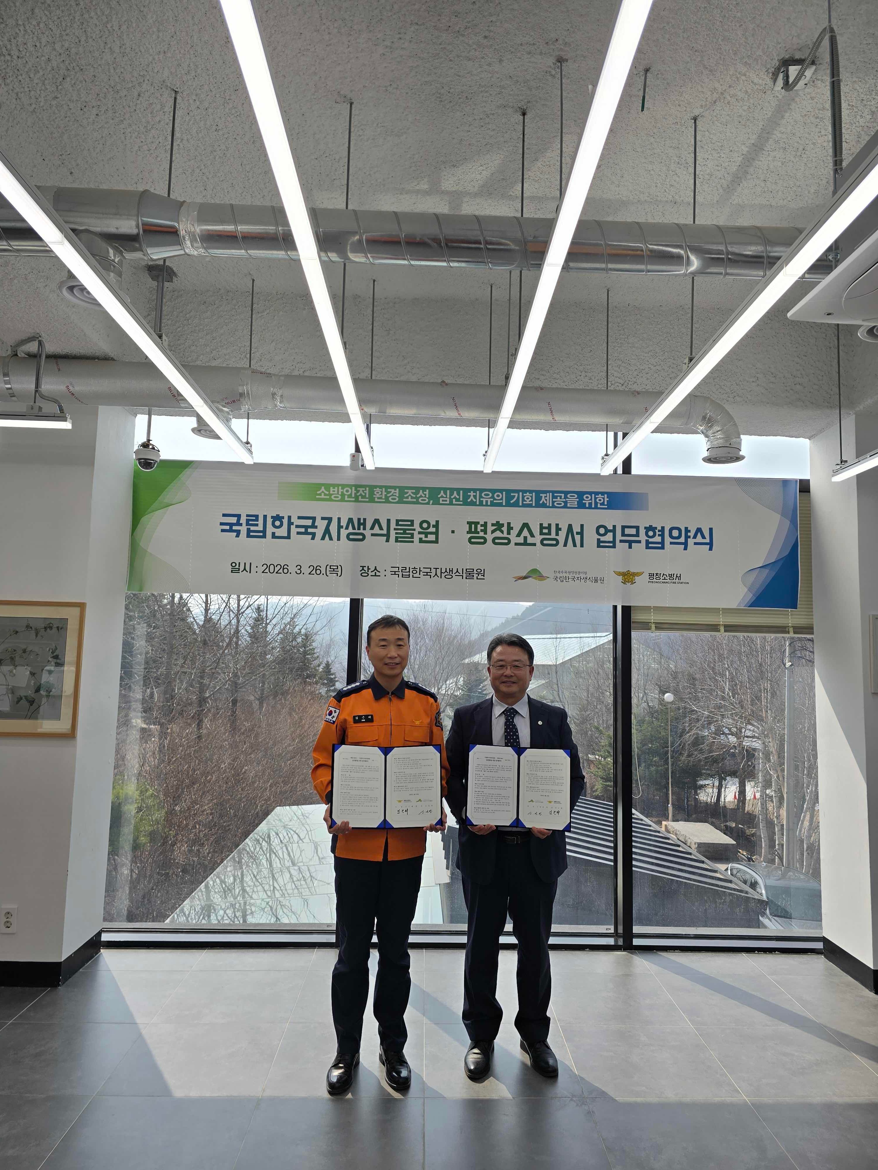 평창소방서(서장 김근태)는 3월 26일 국립한국자생식물원과 재난 대응 역량 강화 및 소방공무원 복지 증진을 위한 업무협약을 체결했습니다.