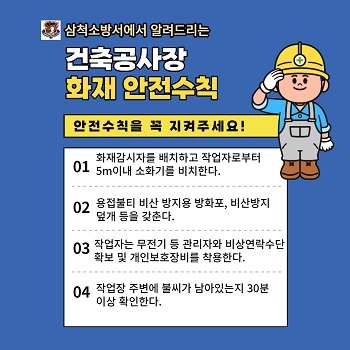 | 762 | 삼척소방서, 공사장 화재 예방수칙 홍보 | 삼척홍보 | 2022-05-09 | 1210 | |