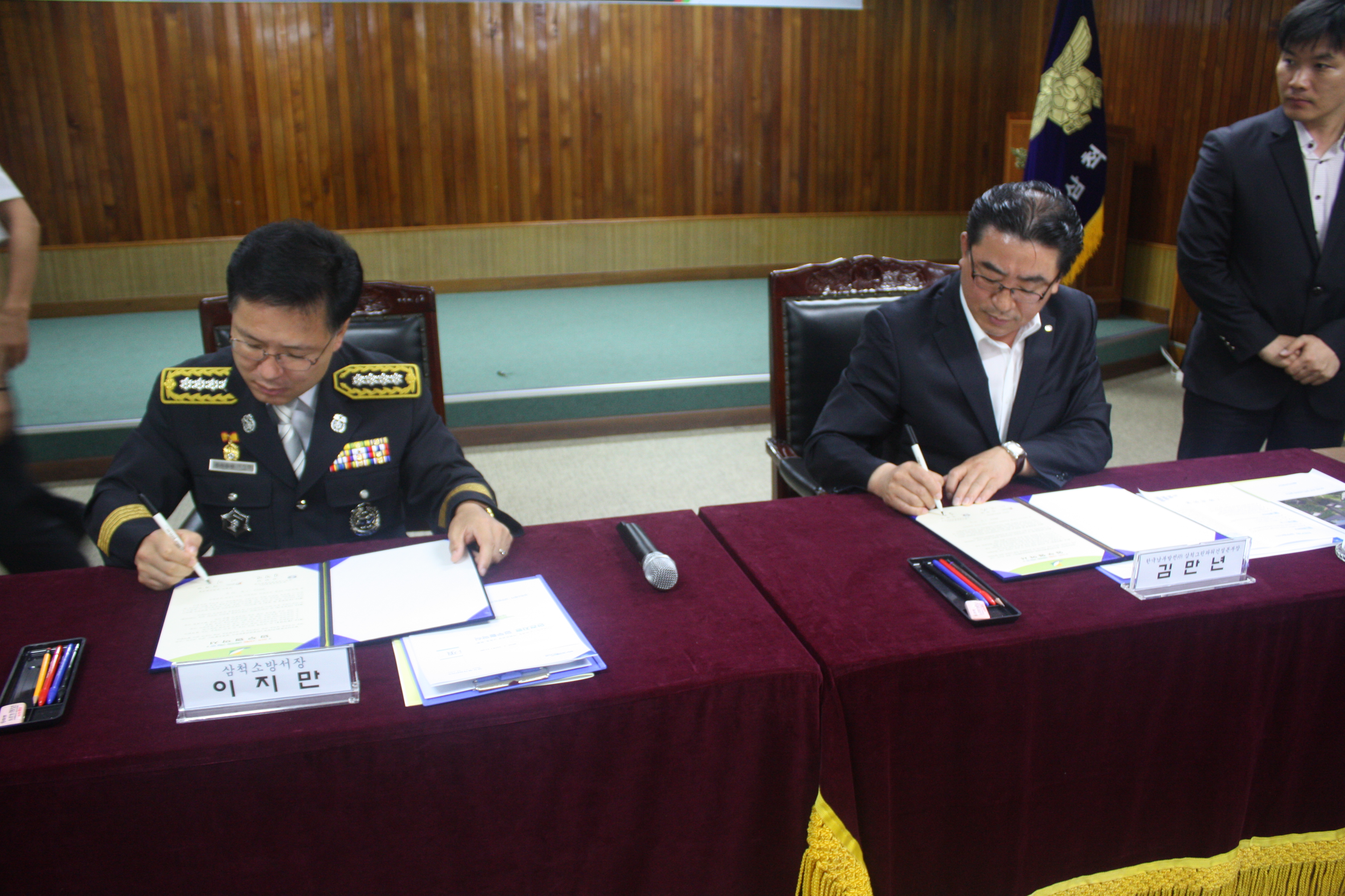 삼척소방서(서장 이지만)는 12일 오전 11시 삼척소방서 대회의실에서 한국남부발전(주) 삼척그린파워건설본부(본부장 김만년)와 저소득, 소외계층 가구에 기초소방시설 보급 지원 및 노후 전기점검을 지원하는 업무협약식(MOU)을 체결했다.