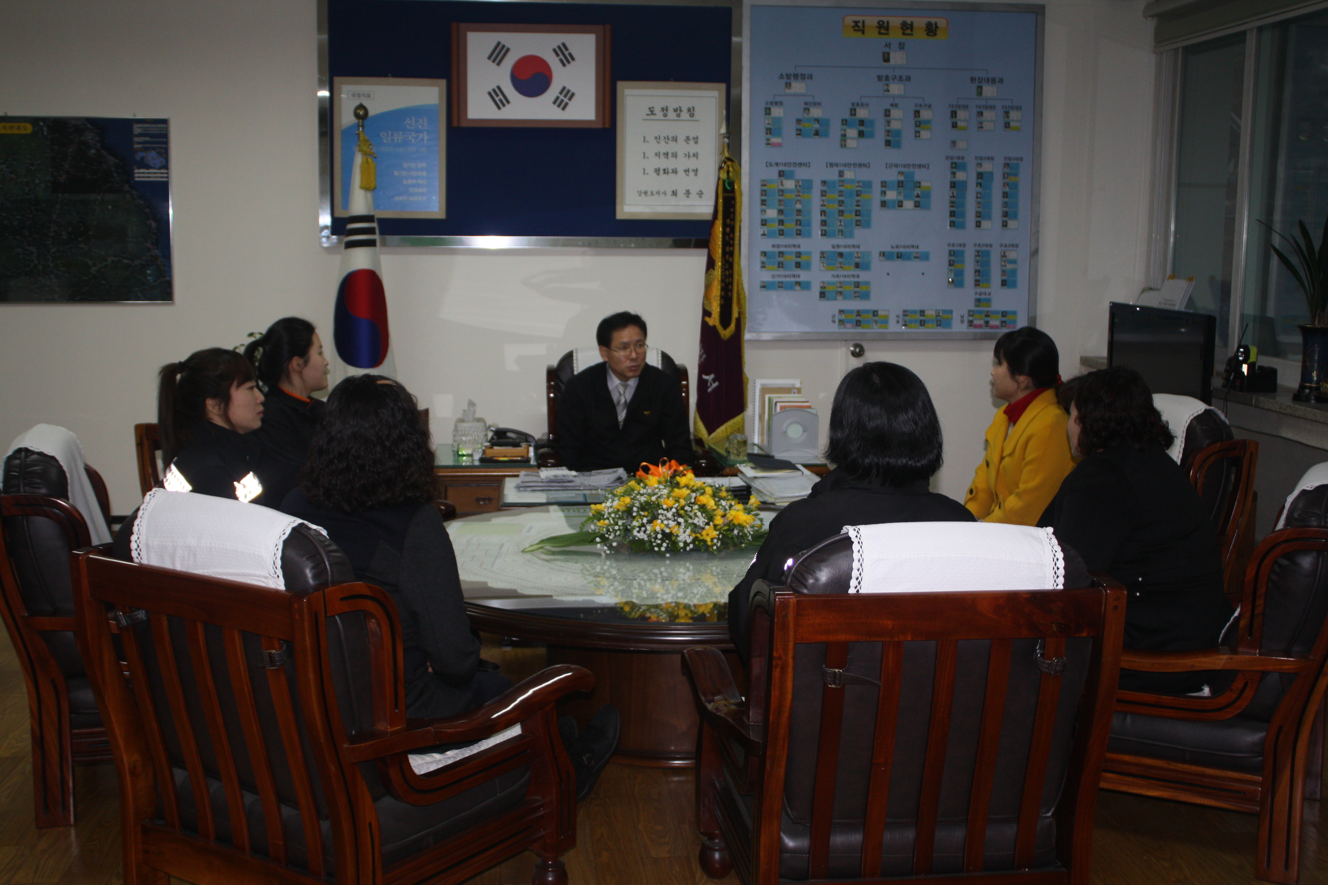 ▲ 삼척소방서는 2013년 2월 5일 17시부터 삼척소방서 여직원 6명과 서장님과의 대화의 시간 및 여직원 간담회를 실시하였다. 소방서내 3.8%의 적은 인원이지만 최선을 다해 일하며,소방가족으로 더욱 즐겁고 돈독하게 생활할 수 있도록 환경을 개선해나가겠다는 훈훈한 대화의 시간을 가졌다.