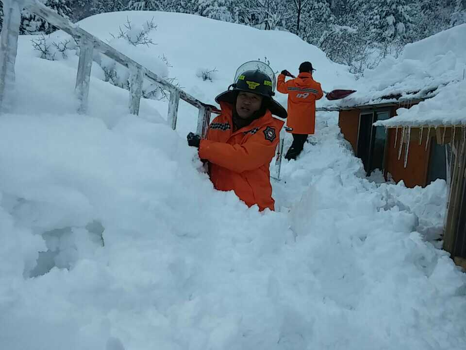 ▲ 삼척소방서 2월 11일 10시 59분 삼척시 중마읍길 암투병중인 김00(여, 59세)씨가 홀로 고립되어있는 집에 스레트 지붕이 붕괴될 것을 우려하여 현장대응과 소방위 박명철외 2명(교 권경민, 교 심재형)의 소방대원들이 300M의 길을 뚫고 출동하여 제설 작업 및 구조를 실시하였다.