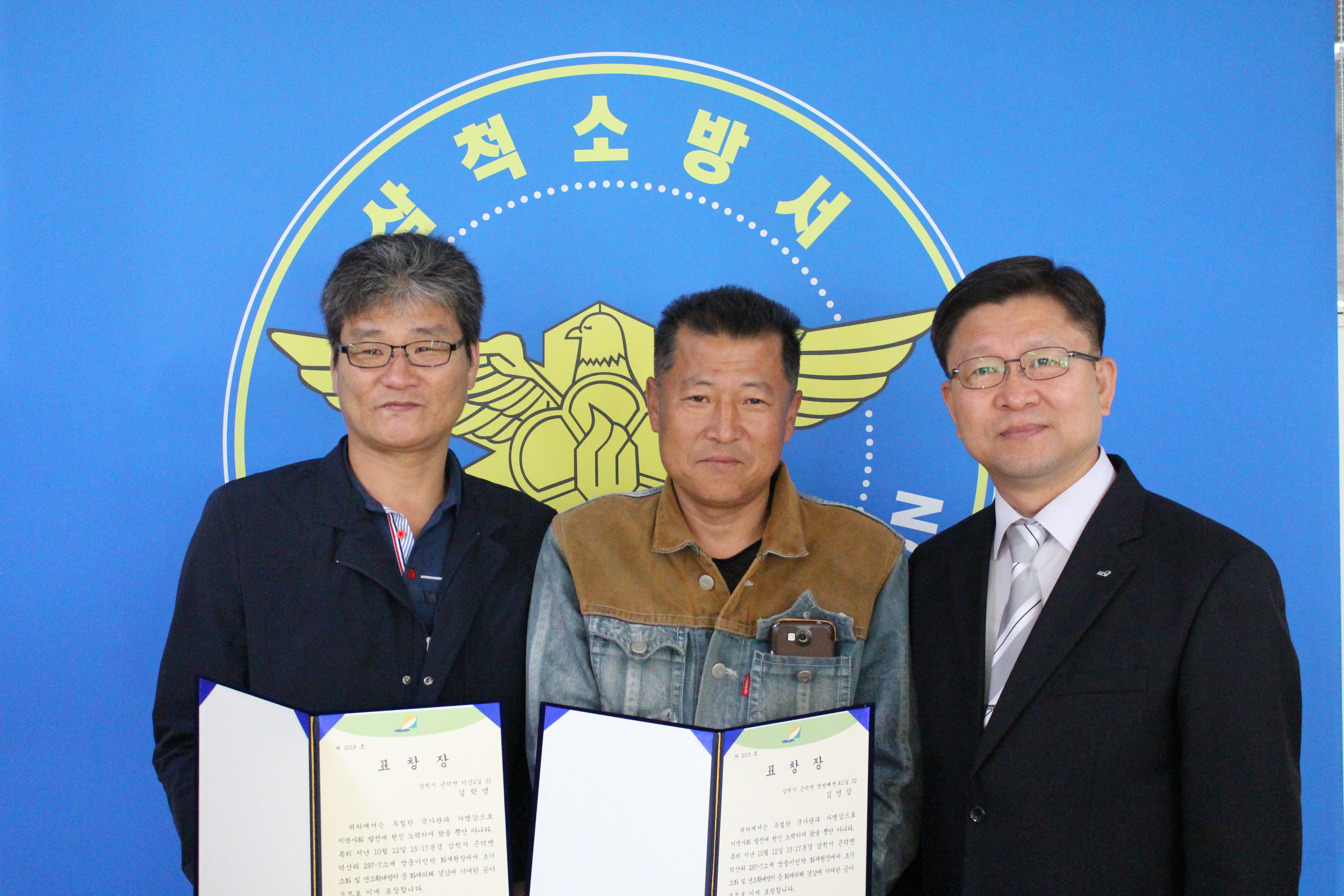 ▲삼척소방서(서장 김형도)는 15일 서장실에서 화재신고 및 초기화재 진압 유공자인 근덕면에 거주하는 김연삼(43), 김학연(45)씨에게 표창장을 수여했다.