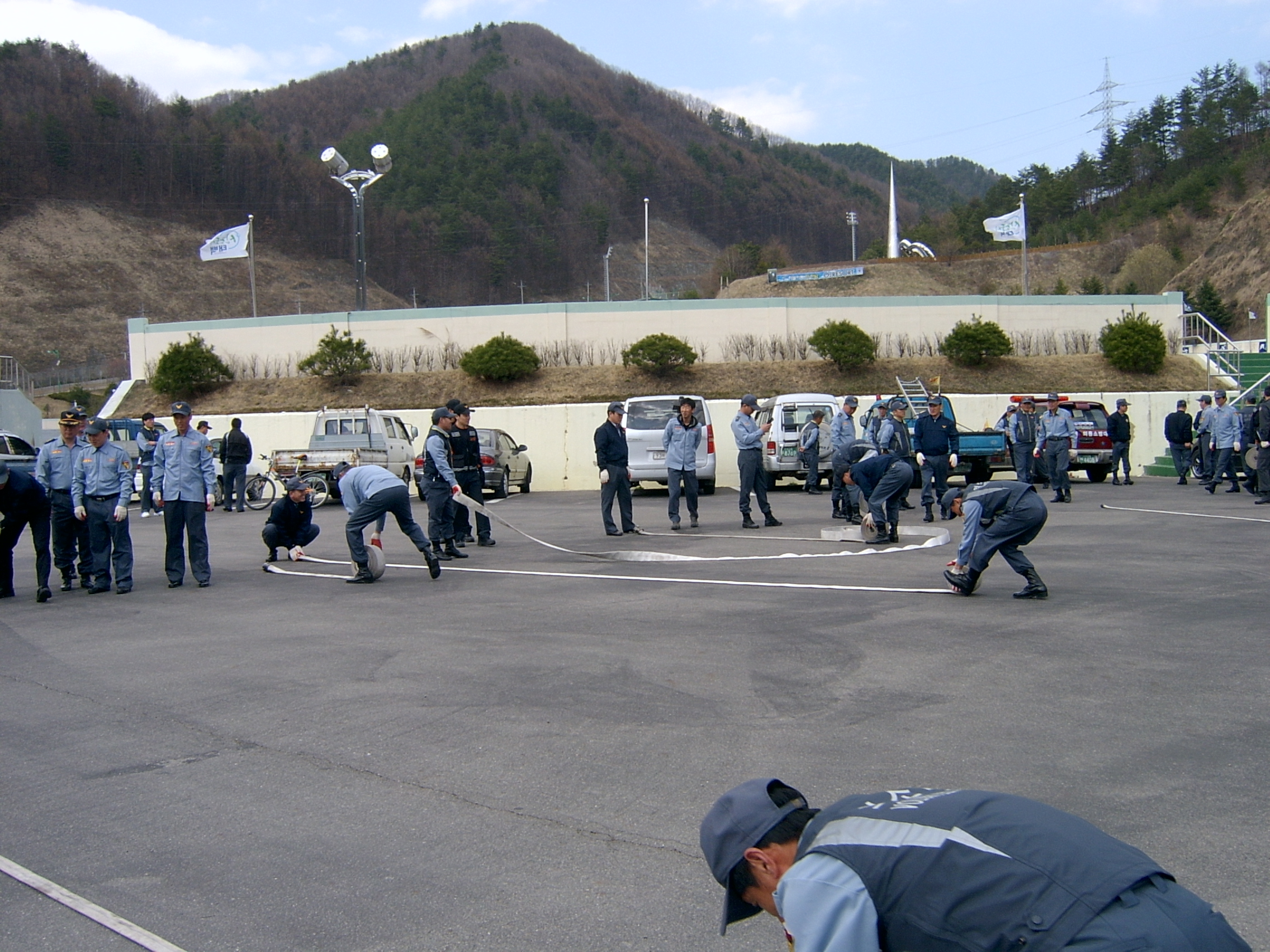 2012, 4월 18일 태백종합경기주차장의 넓은 공터에서 실전을 방불케하는 남성의용소방대전원이 참석한가운데 4월 정기교육이 있었습니다 .