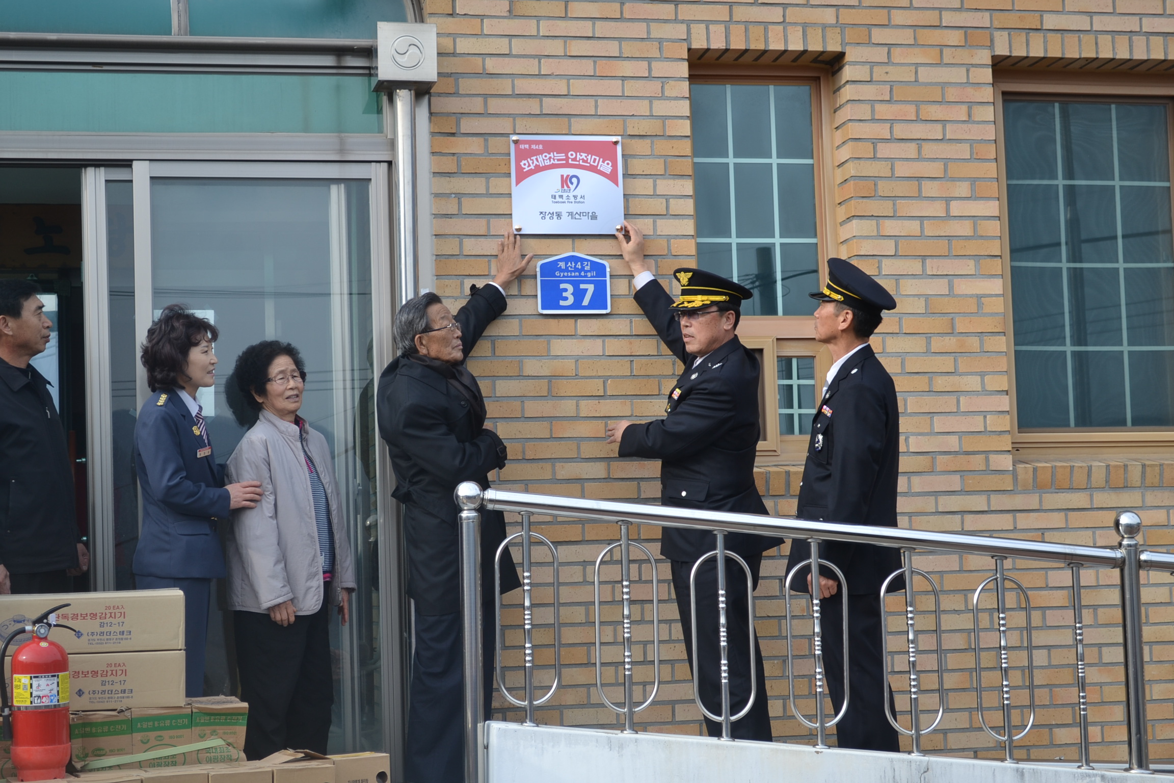 태백소방서(서장 김진봉)는 11.22(목) 14시 장성동 계산마을회관에서 하반기 "화재없는 안전마을" 조성 현판식 및 명예소방관 위촉식과 함께 소화기 및 단독형감지기를 무료로 설치보급하였습니다.