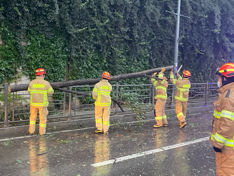 제11호 태풍 힌남노가 북상 중인 6일 오전 6시 30분께 강원 태백시 장성동 인근 도로에서 나무가 쓰러져 태백소방서 구조대가 안전조치를 하고 있다.