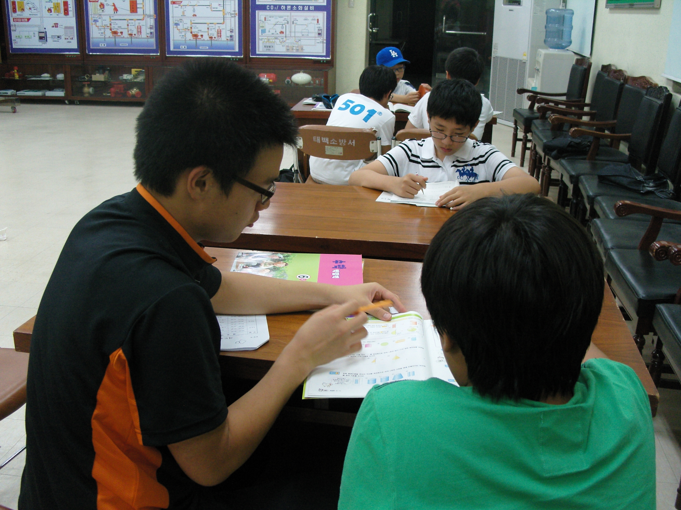 태백소방서 소속 의무소방원 2명(성인경, 최승환)이 3층 대회의실에서 초등학생과 중학생들을 대상으로 영어와 수학을 지도하고 있다. 방학기간 중 시범적으로 우선 태백소방서 직원 자녀들을 대상으로 운영한 후 성과에 따라 관내 불우학생을 대상으로 확대운영할 계획이다.