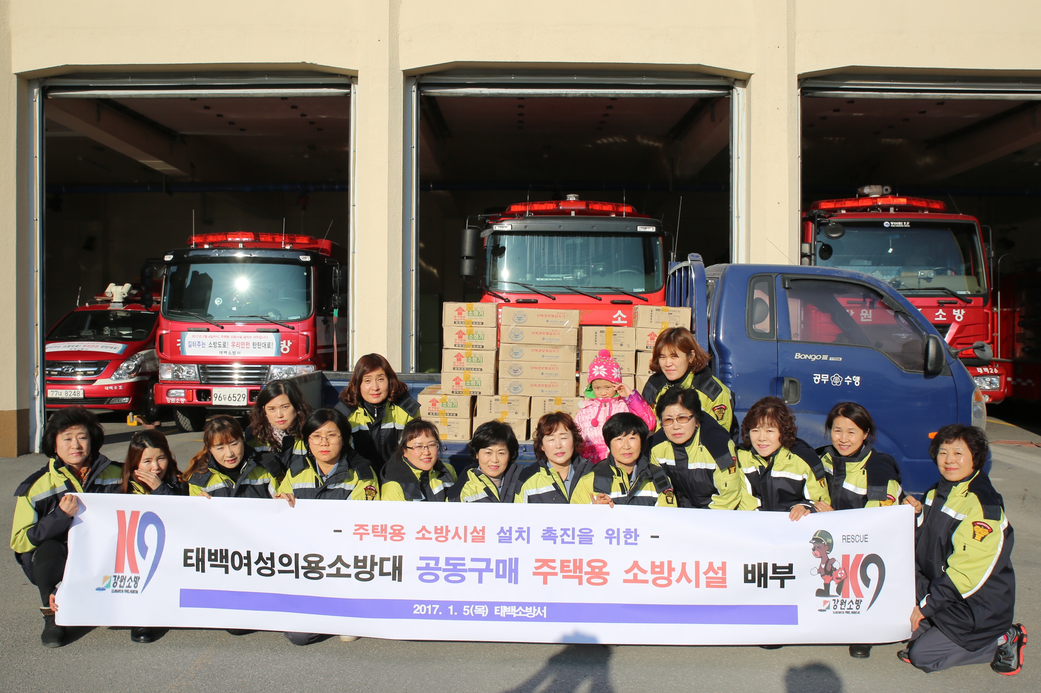태백여성의용소방대는 대원들의 주택과 황지동 현대연립 등 대원들이 거주하고 있는 2개 마을 86가구에 주택용 소방시설 설치를 안내하여 소화기 67대, 감지기 90대를 공동구매해 설치를 완료했다.