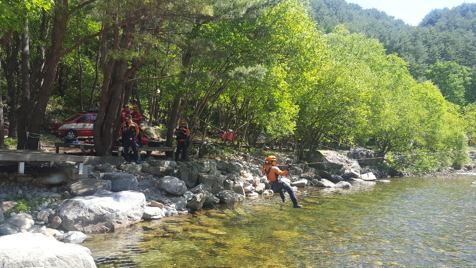 ○ 이날 훈련은 게릴라성 집중호우로 인해 하천변에서 야영 중이던 야영객 4명이 계곡에 고립되어 신고를 받은 상황을 가정하였다.
