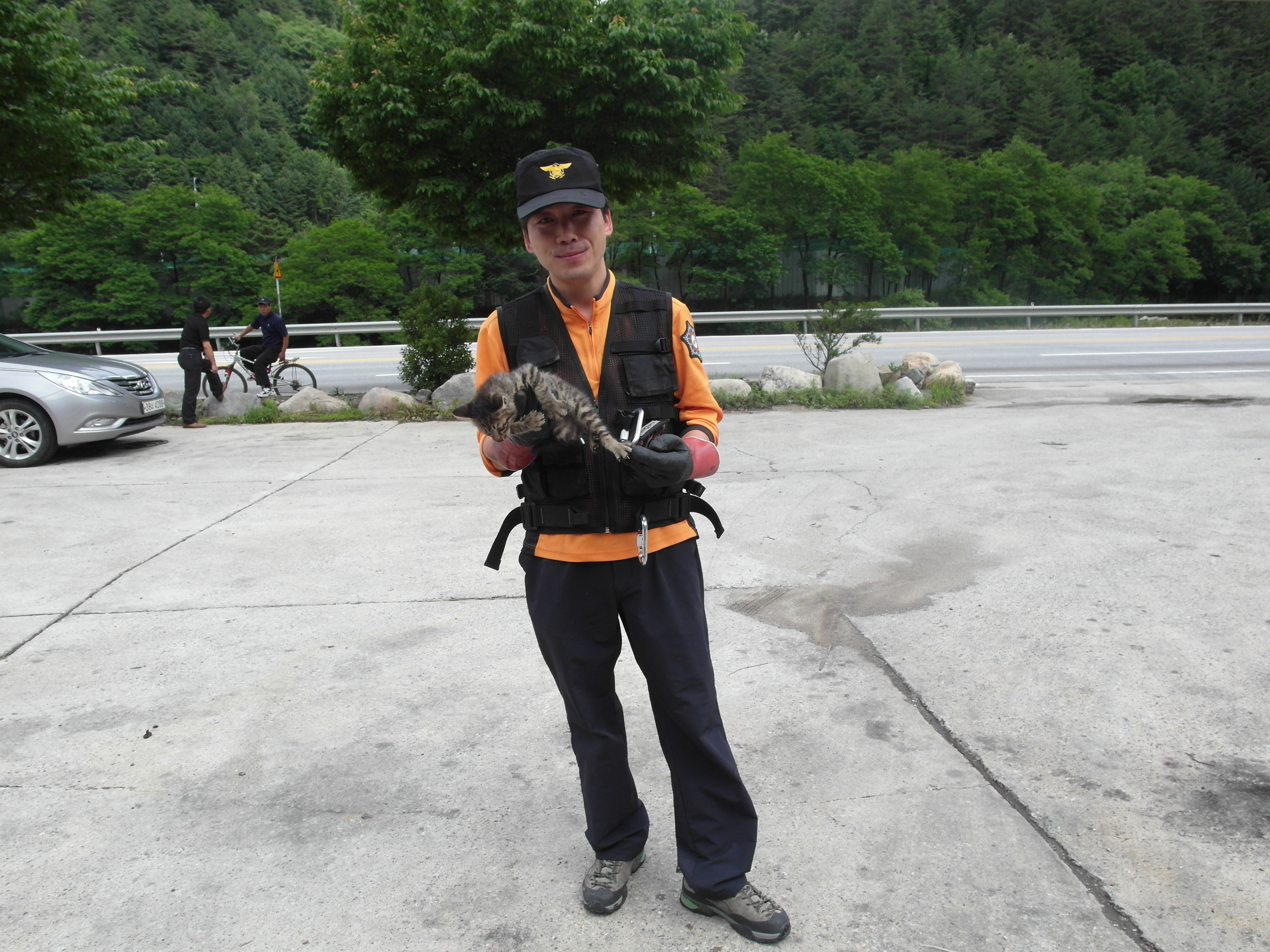 오늘 오전 10시경에 태백시 구문소 옆 주차장에서 새끼 고양이 한마리가 차 밑에 들어간 뒤 나오지 않아 만약, 그냥 달릴 경우에 고양이가 떨어져 사고가 날 위기에 처한 상태에 119에 연락을 하니 119대원들이 오셔서 카센터까지 길을 안내해줌과 동시에 카센터에서 차를 높이 들어 차 밑에 숨어있는 고양이를 발견하여 구조해주셨습니다.