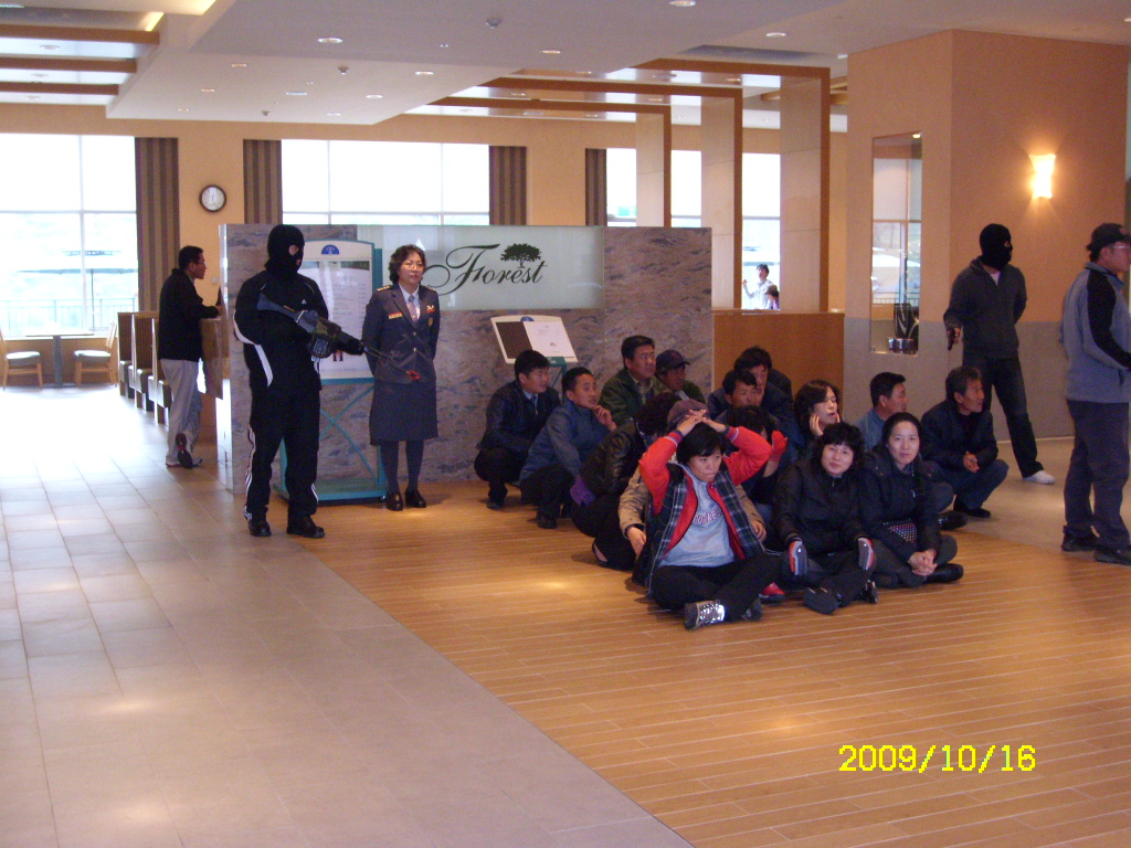 복면한 테러범들이 우리에게 공포탄을 쏘며 위협을 할 때, 훈련임에도 불구하고 사실 우리들은 굉장히 무서웠습니다.