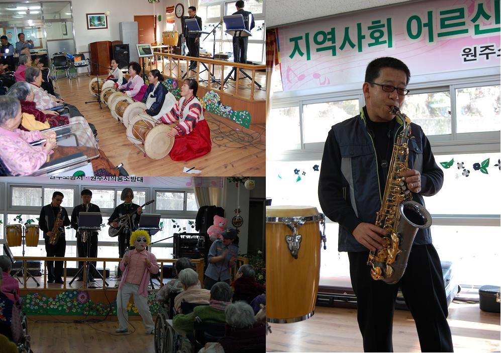 원주시의용소방대(대장 함성호)는 노인복지시설에 계시는 노인을 대상으로 위문공연을 준비, 119밴드를 결성하여 23 ~ 24일 2일간 오후 2시부터 노인복지시설인 상애원과 사랑의집을 찾아 밴드공연 및 국악인을 초청하여 노인들을 위한 다채로운 위문공연을 하였습니다.