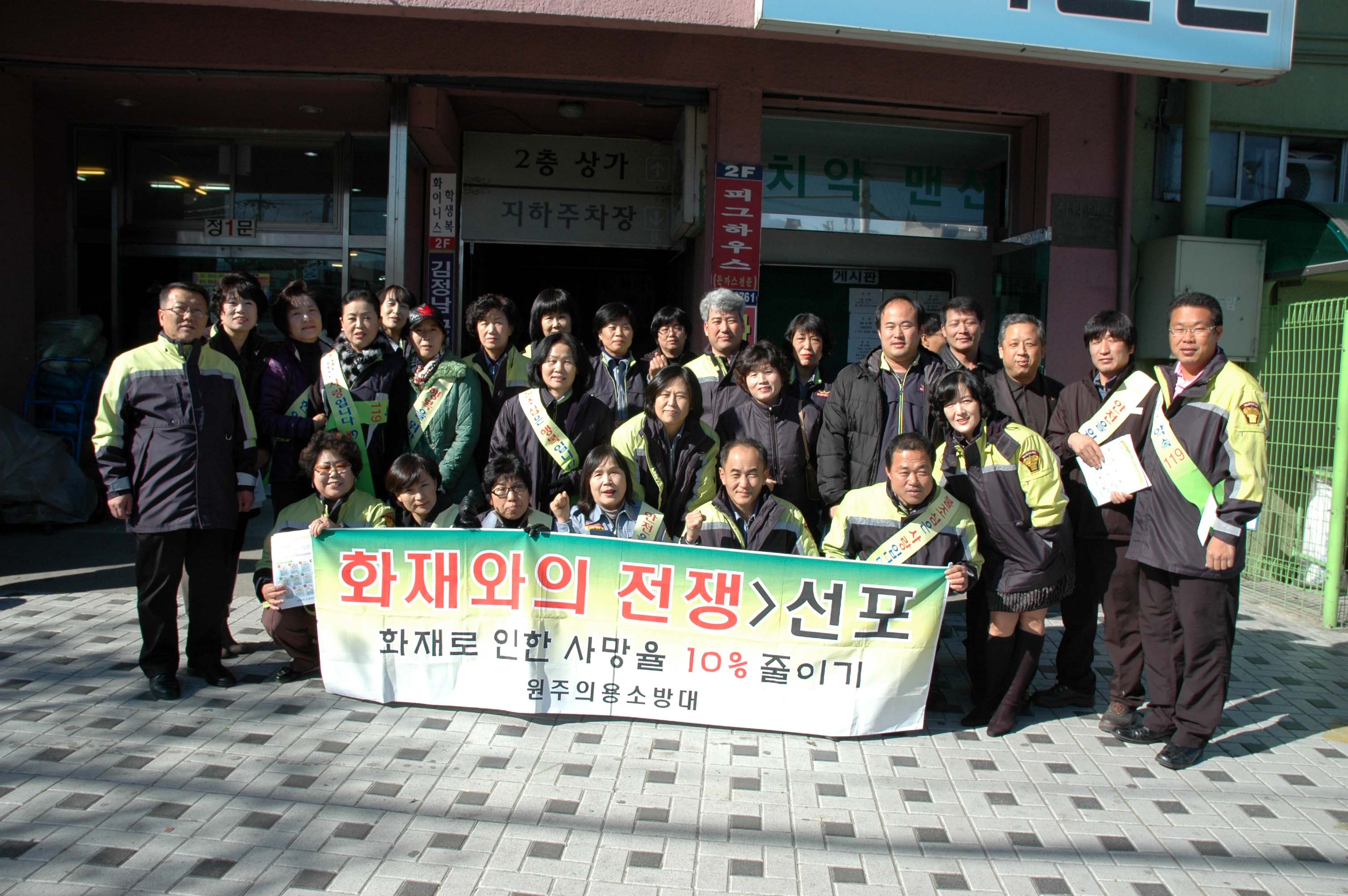 원주의용소방대(대장 조성일)과 원주여성의용소방대(대장 이현자)는 11월18일 화제예방 켐페인을 남부시장 부근과 치악산 국형사입구에서 남 의소대 15명, 여 의소대20명이 참가하여 켐페인을 실시했다