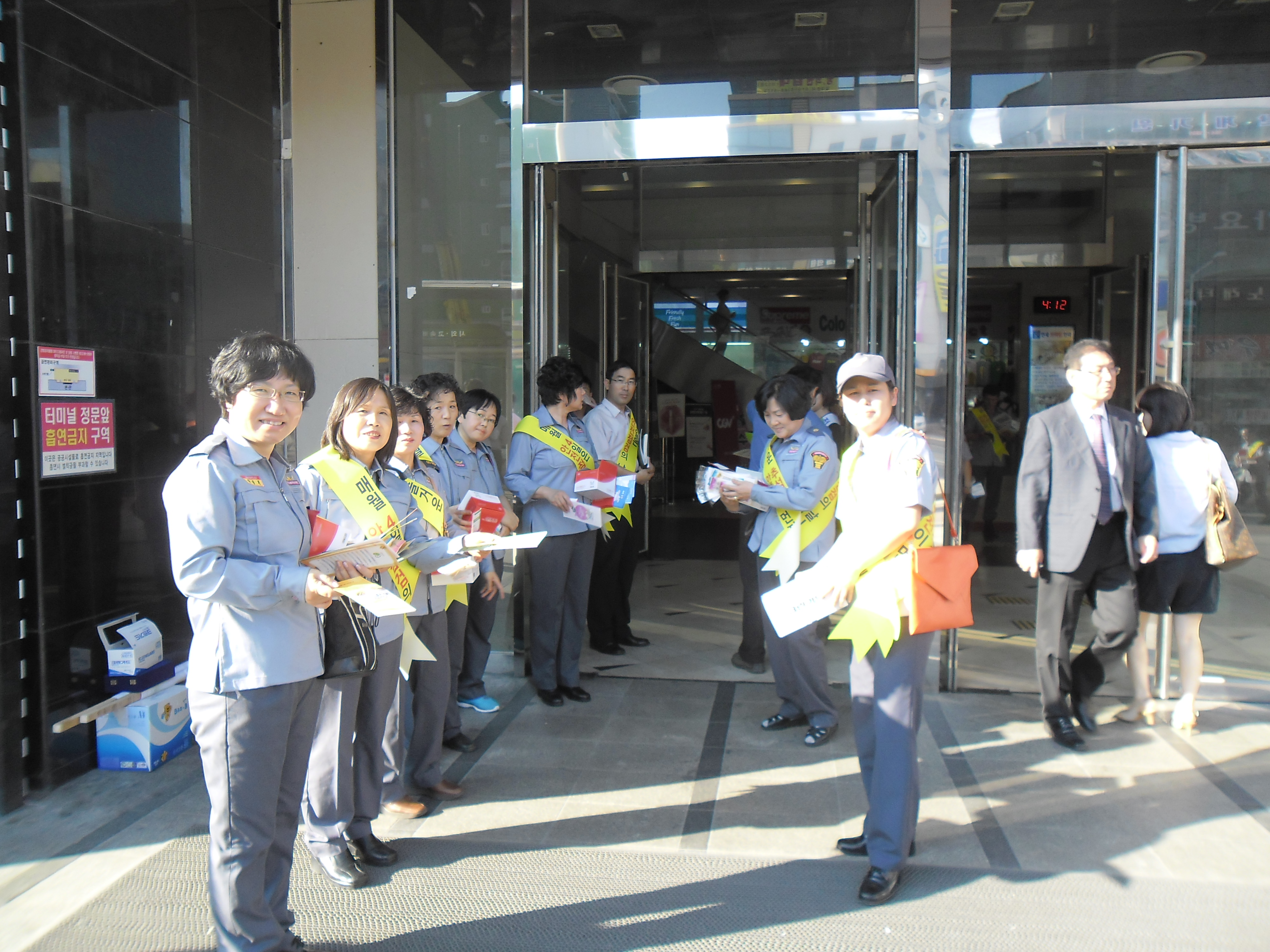 고속버스터미널에서 어깨띠 두르고 사진촬영