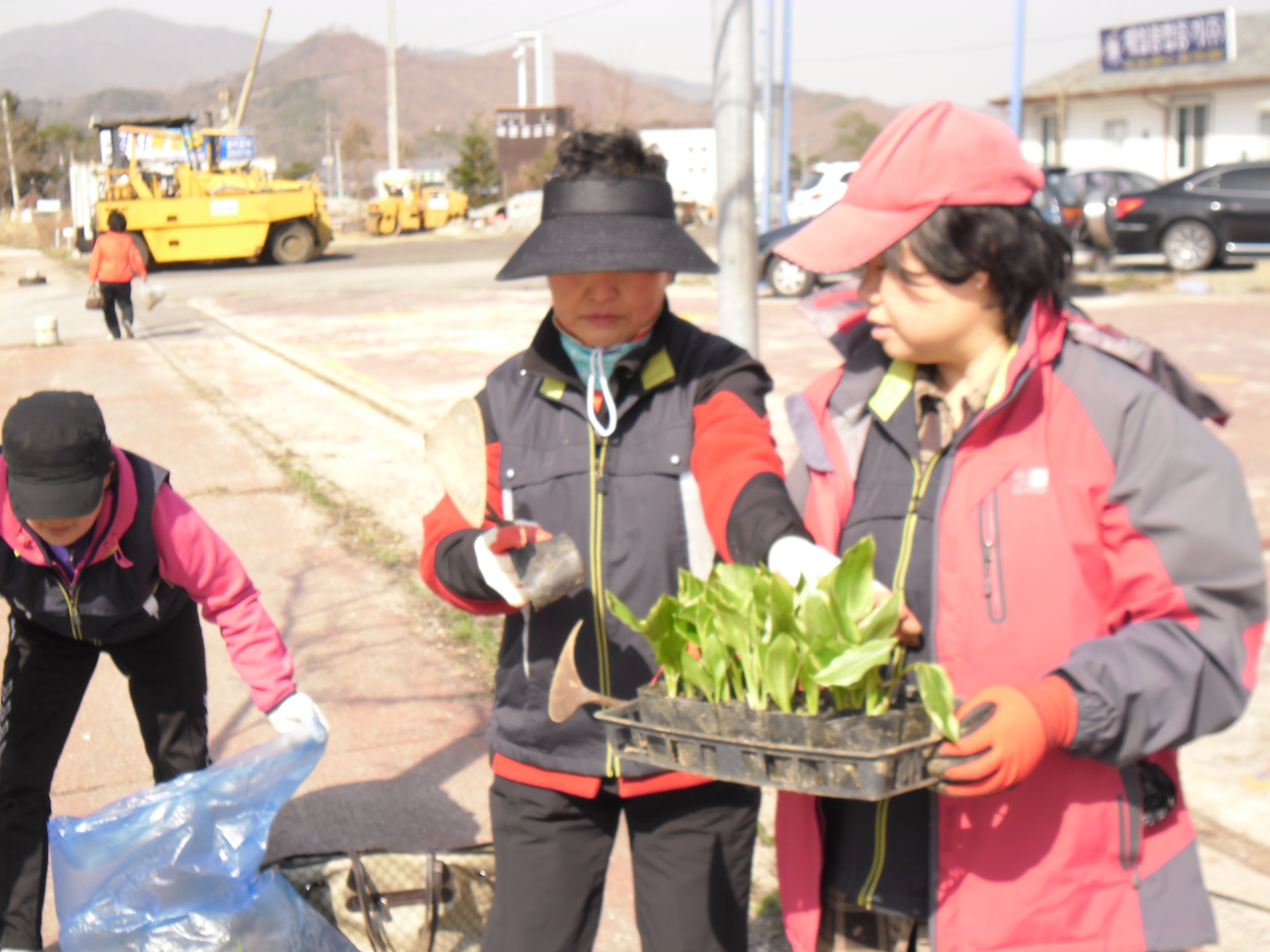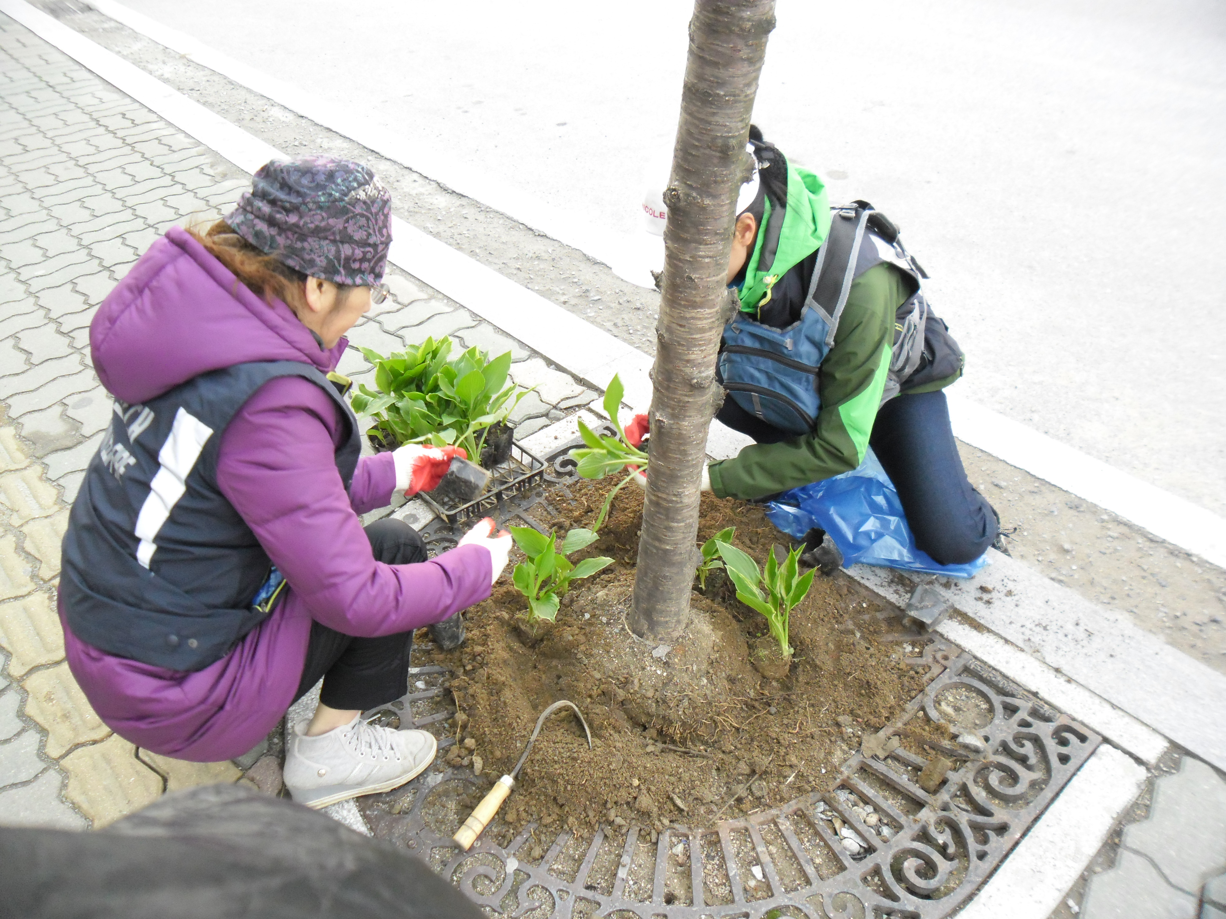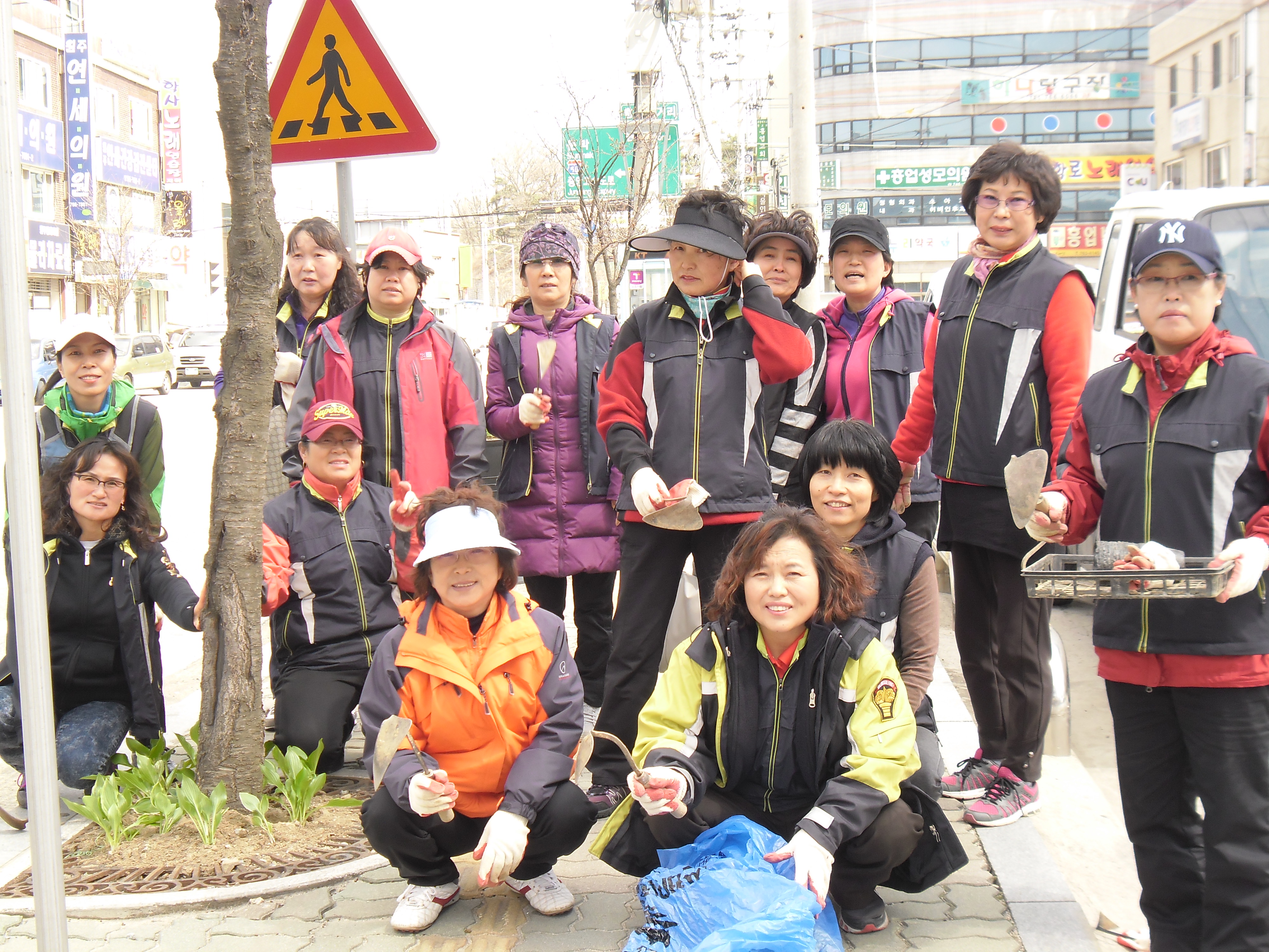 흥업 여성대원들은 거리환경 정화 를 하기위하여 벗나무 화단 비비츄 심기를 실시하였습니다 ~~