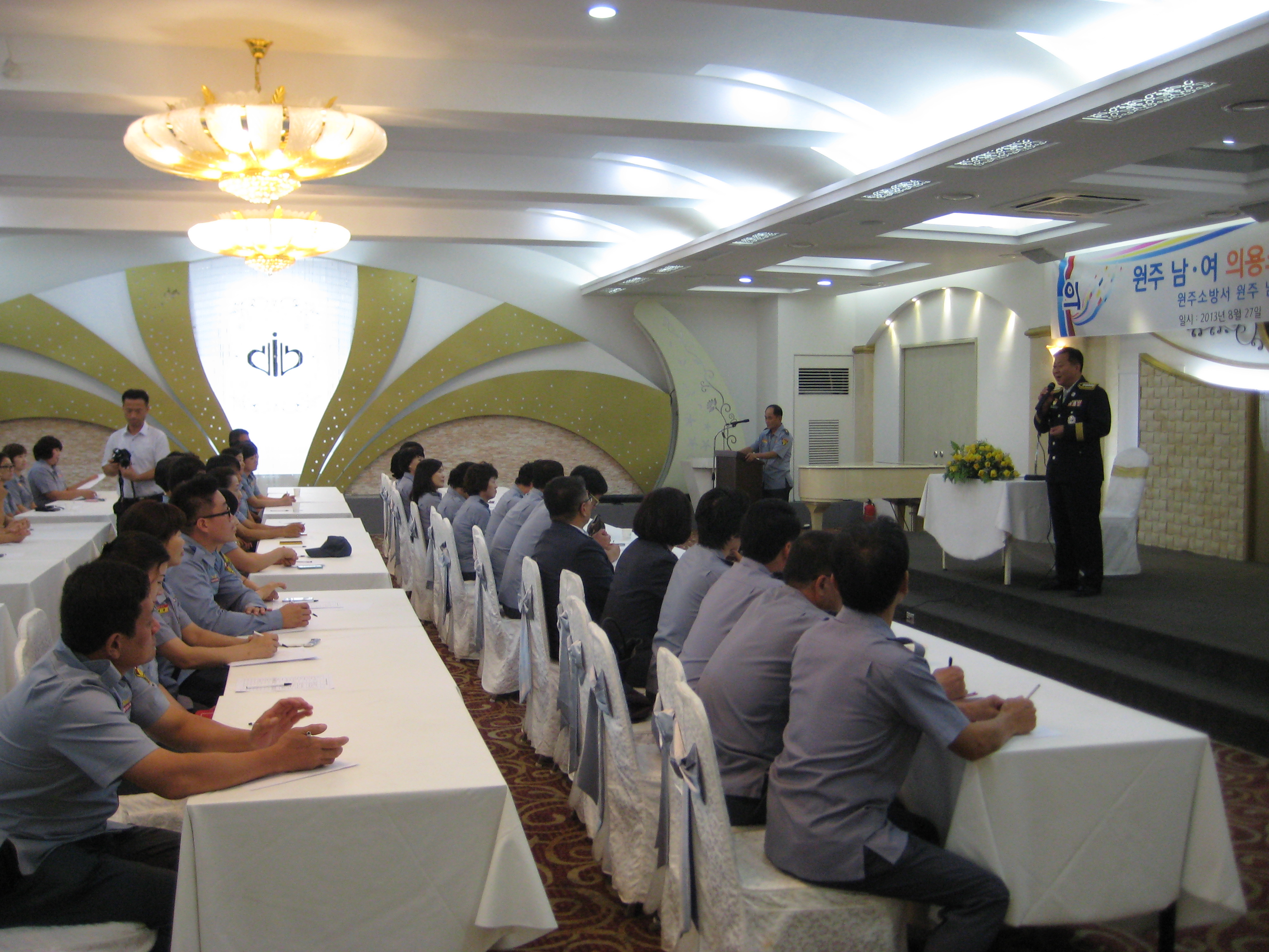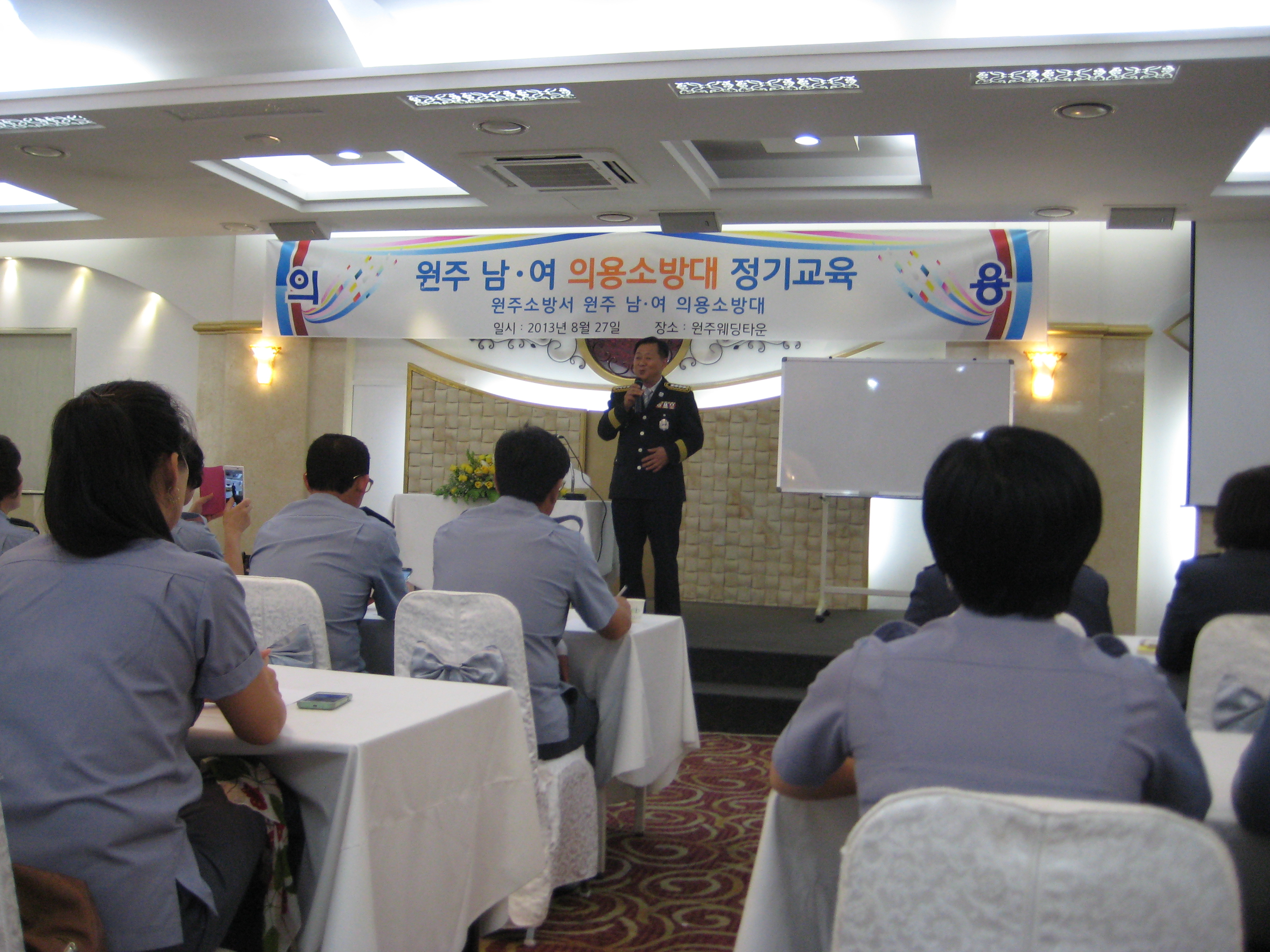 원주의용소방대(대장 조성일)와 원주 여성의용소방대(대장 박명자)는 8월27일 16:00 - 20:00시까지 8월 정기교육을 원주웨딩홀 3층에서 남,여 대원 80명이 참가했습니다. 새로 부임하신 김상철 서장님의 의용소방대의 앞으로 발전적인 교육을 해 주셨고, 원주의용소방대가 강원도 의용소방대 종합평가 최우수상을 받아 축하 자리도 열렸습니다.