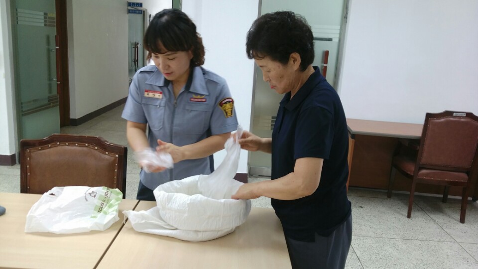흥업여성 의용소방대는 정기교육시 쌀을 모아서