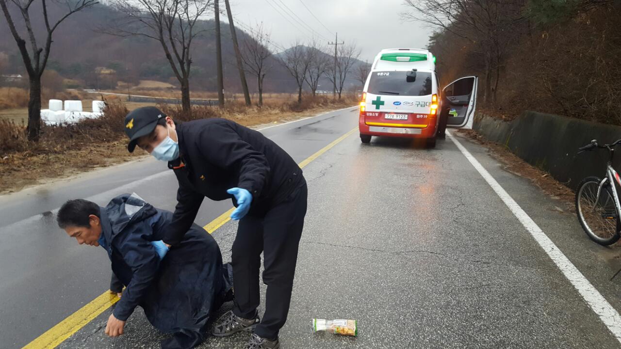 부론에서 원주 대안리방면 국도에서 도로 한가운데 쓰러져 정신잃은 취객 발견 후 차량 바상등켜고 안전거리 확보 후 112,119에 신고. 큰건물없는 시골길에선 112선터에 가까운 근처 전봇대의 상단 7자리 숫자 말해주면 바로 위치확인 가능. 5분만에 경찰,구급대 도착 후 인계하고 귀가