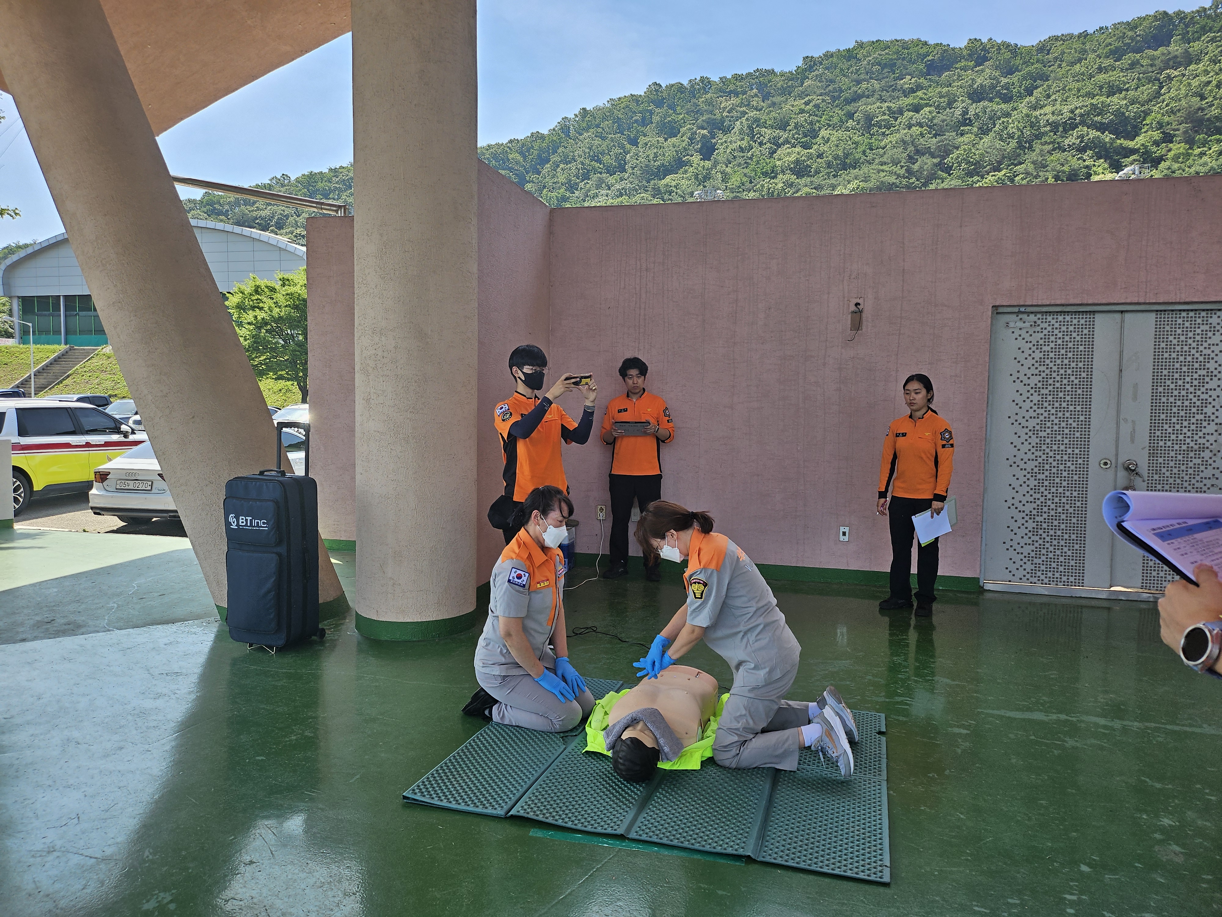 심폐소생술 : 김옥수 부대장 . 최미라 대원